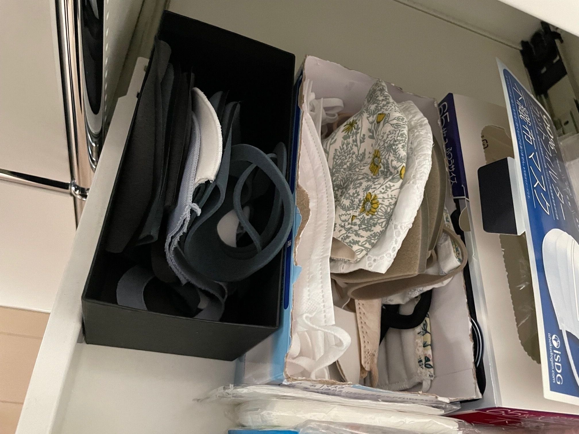 全然おしゃれでないマスクの箱も、蓋を切ってしまい、洗えるマスクの収納に再利用しています。