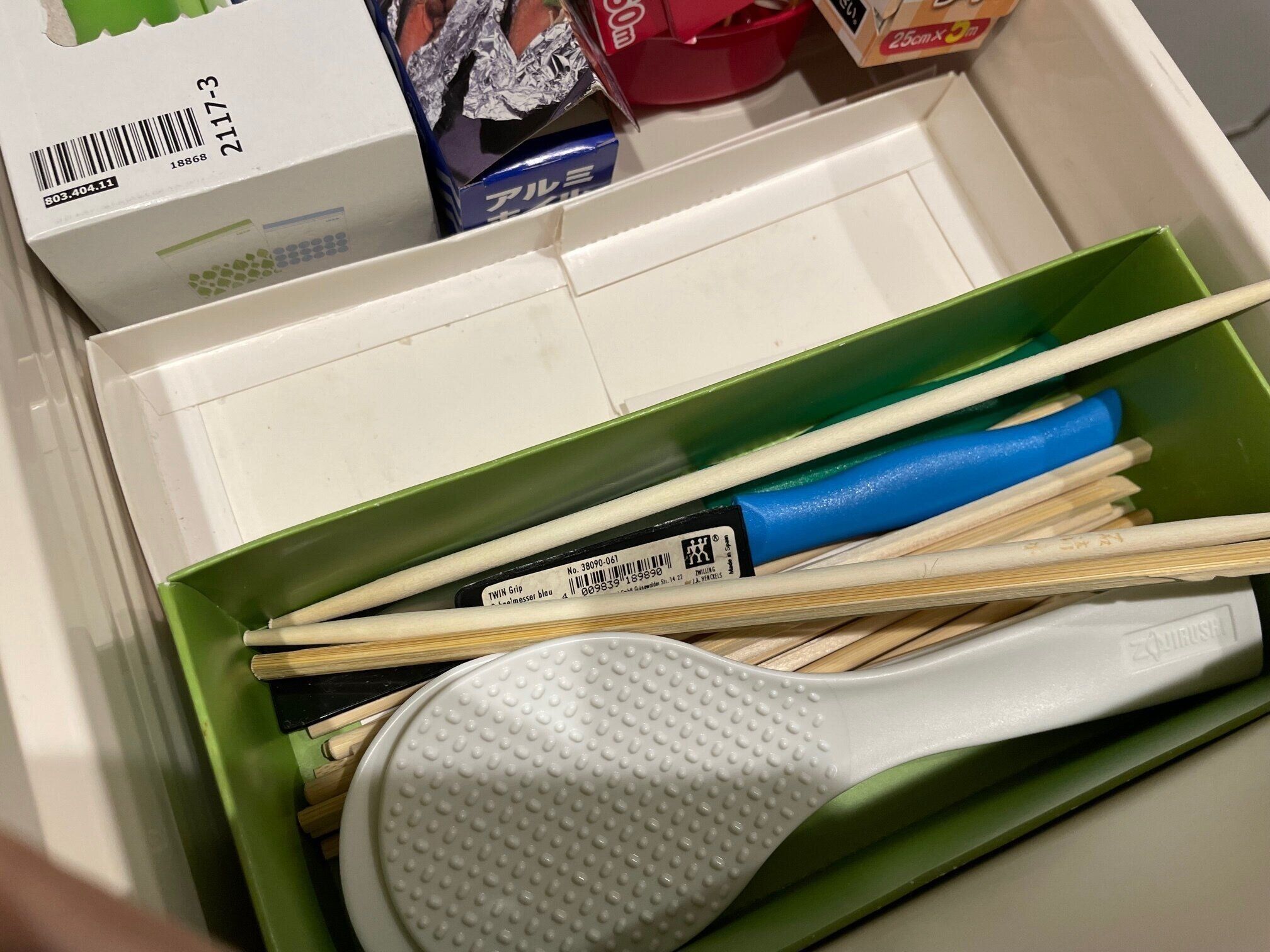 キッチンの引き出しにこのように箱を入れれば、100均で収納ボックスを買わずとも、小分けにキッチンバサミやしゃもじなどを収納することができます。