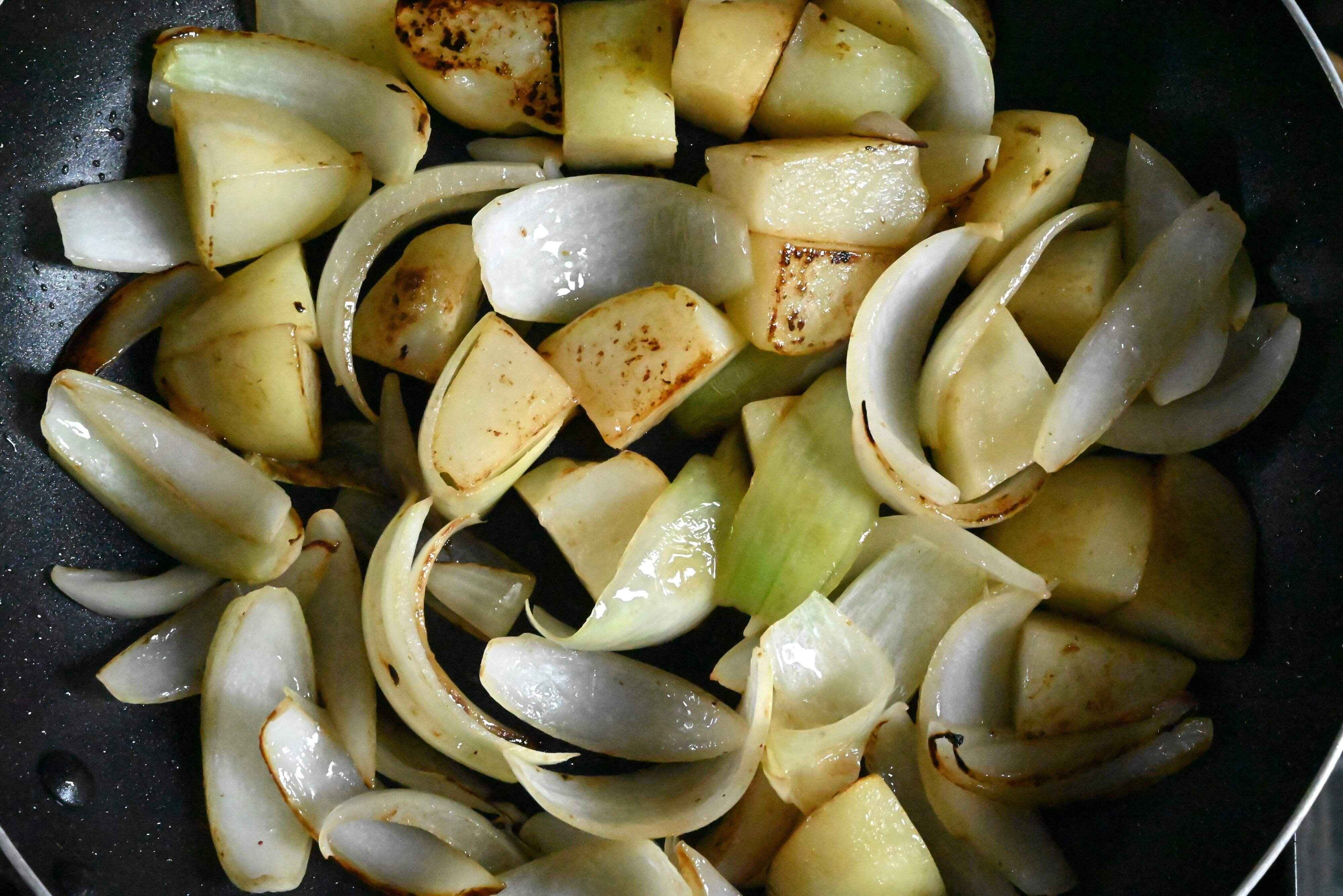 (5)じゃがいも、玉ねぎ、カシューナッツを加えて5分加熱する。