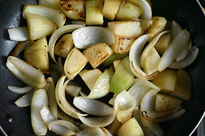 (3)フライパンにサラダ油を入れてじゃがいも、玉ねぎに焼き色がつくまで加熱して取り出す。