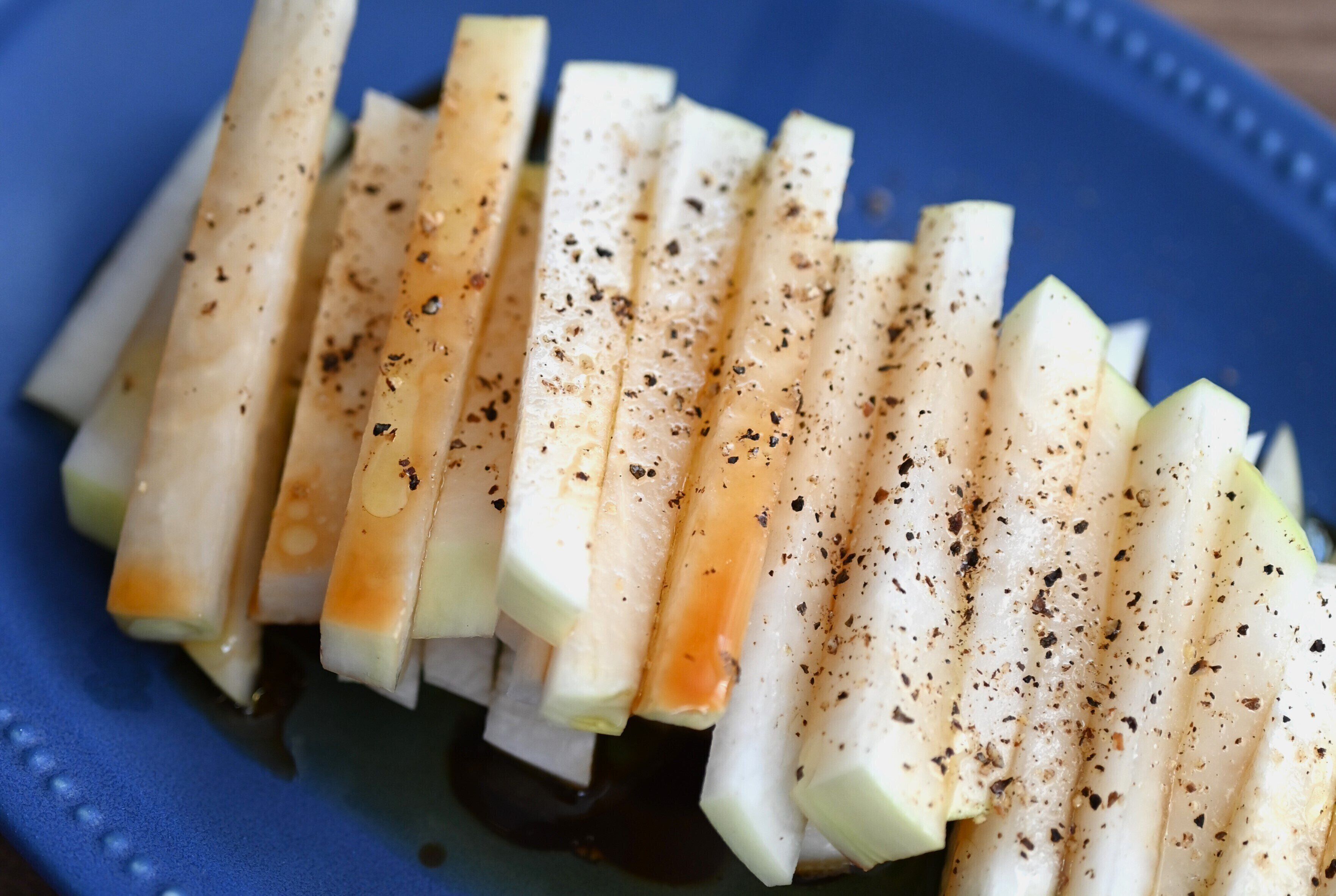(1)大根を5mm~1cm程度の棒状に切って器に盛る。