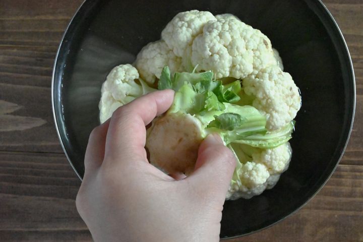 カリフラワーは表面ではなく、つぼみの隙間に汚れやほこりが詰まっているので、流水で流すだけではきれいに洗えません。