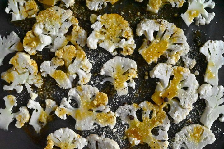 (3)カリフラワーにドレッシングをかけ、粉チーズ、粗びき黒こしょうをかけて完成。