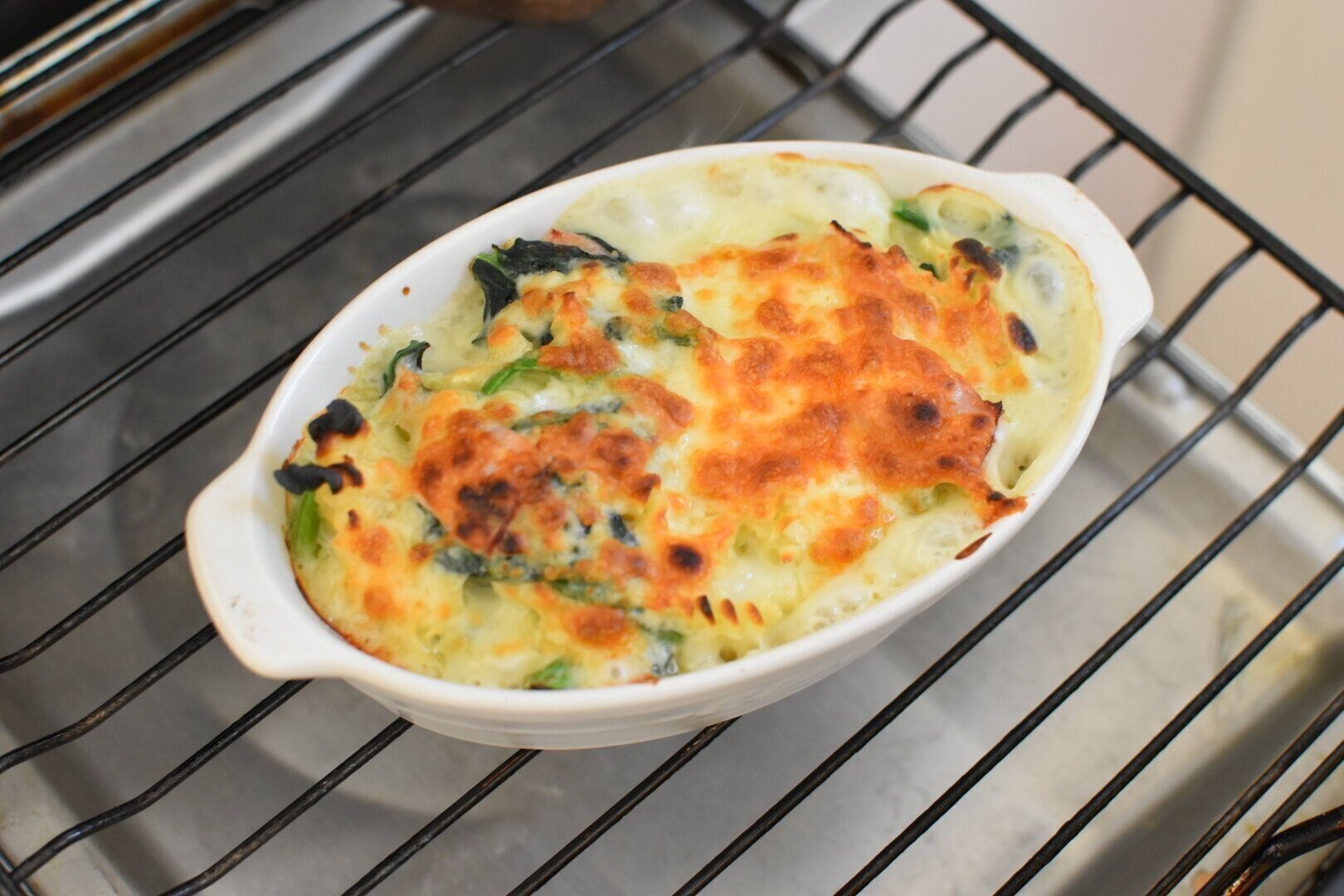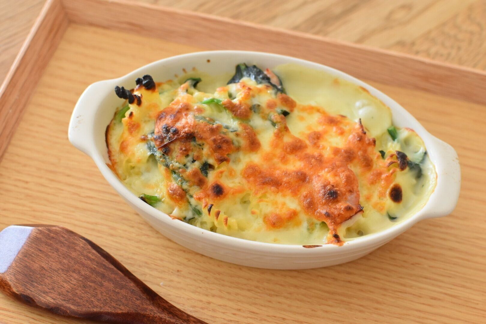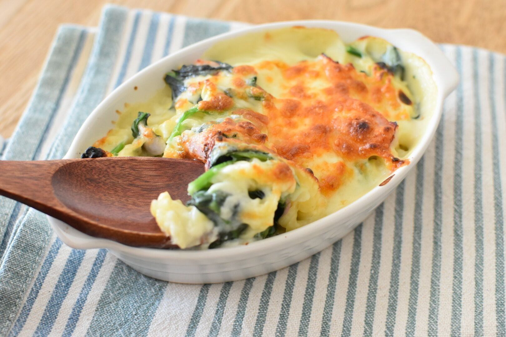 ほうれん草にさつまいも、ベーコンにチーズと栄養面でもばっちりのグラタンになりました。