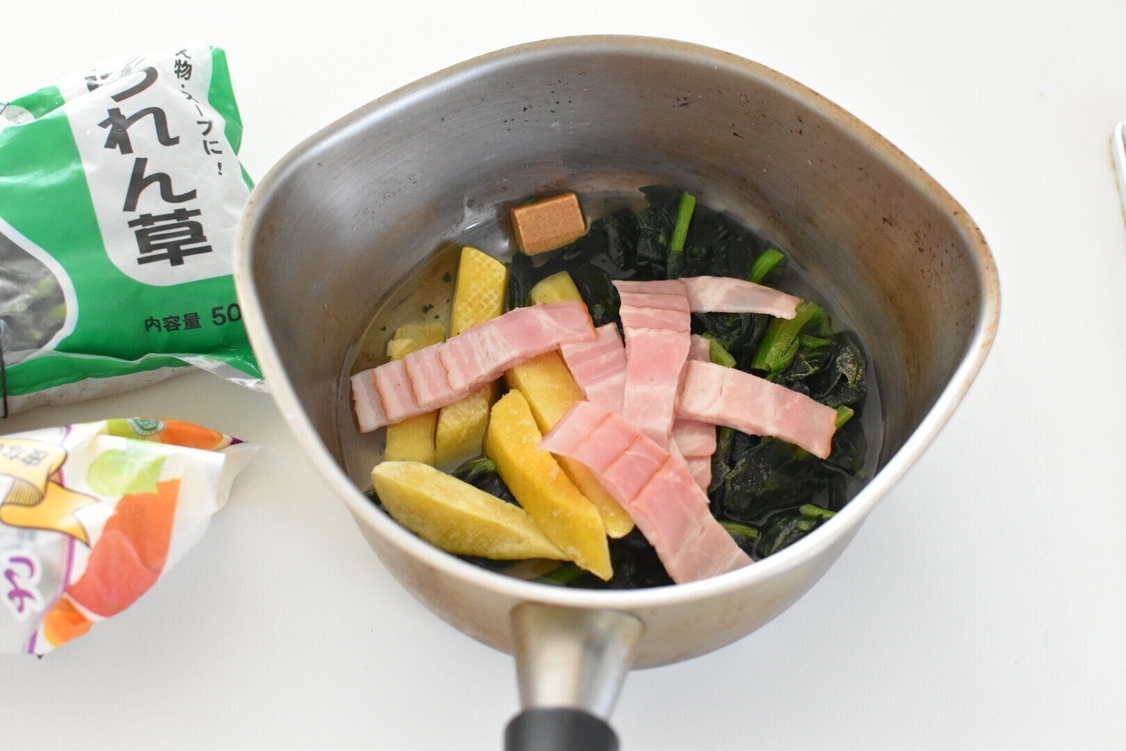1.小鍋に冷凍ほうれん草、冷凍さつまいも、食べやすいサイズに調理用ハサミでベーコンをカットしながら加え、ひたひたになるくらいの水、コンソメキューブを入れて中火にかける