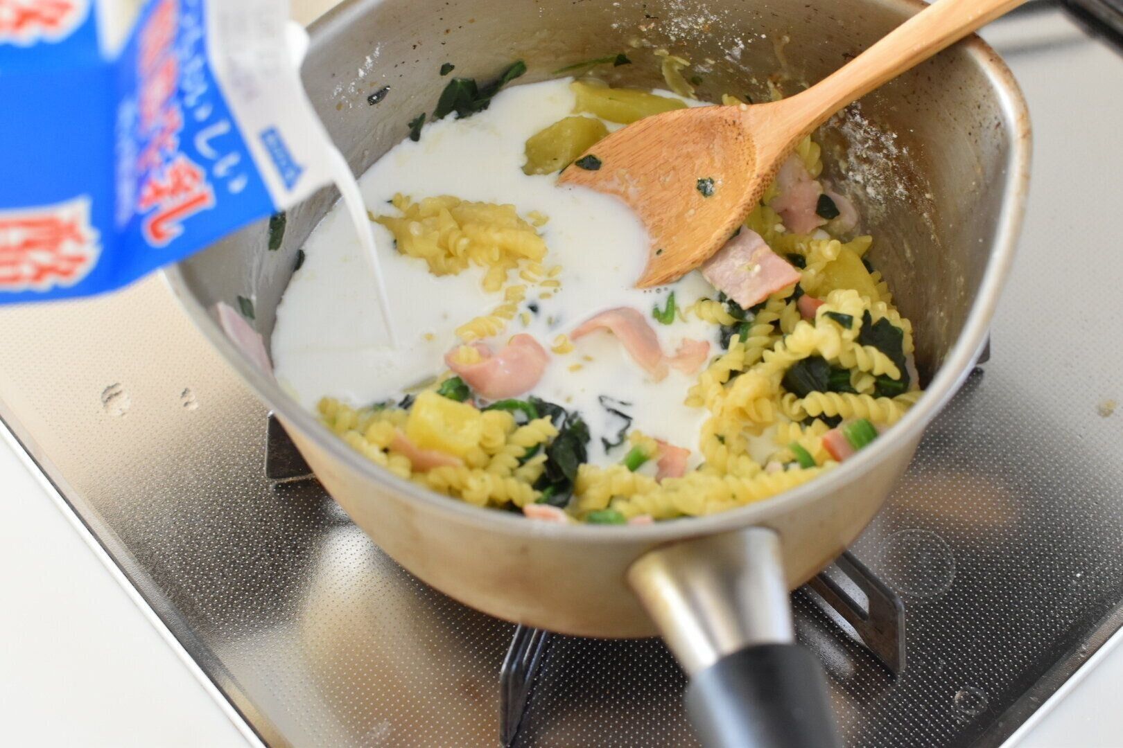 3.マカロニが柔らかくなったら小麦粉を加えてよくまぜて溶かし、牛乳を加えて全体にとろみがついたら火を止める