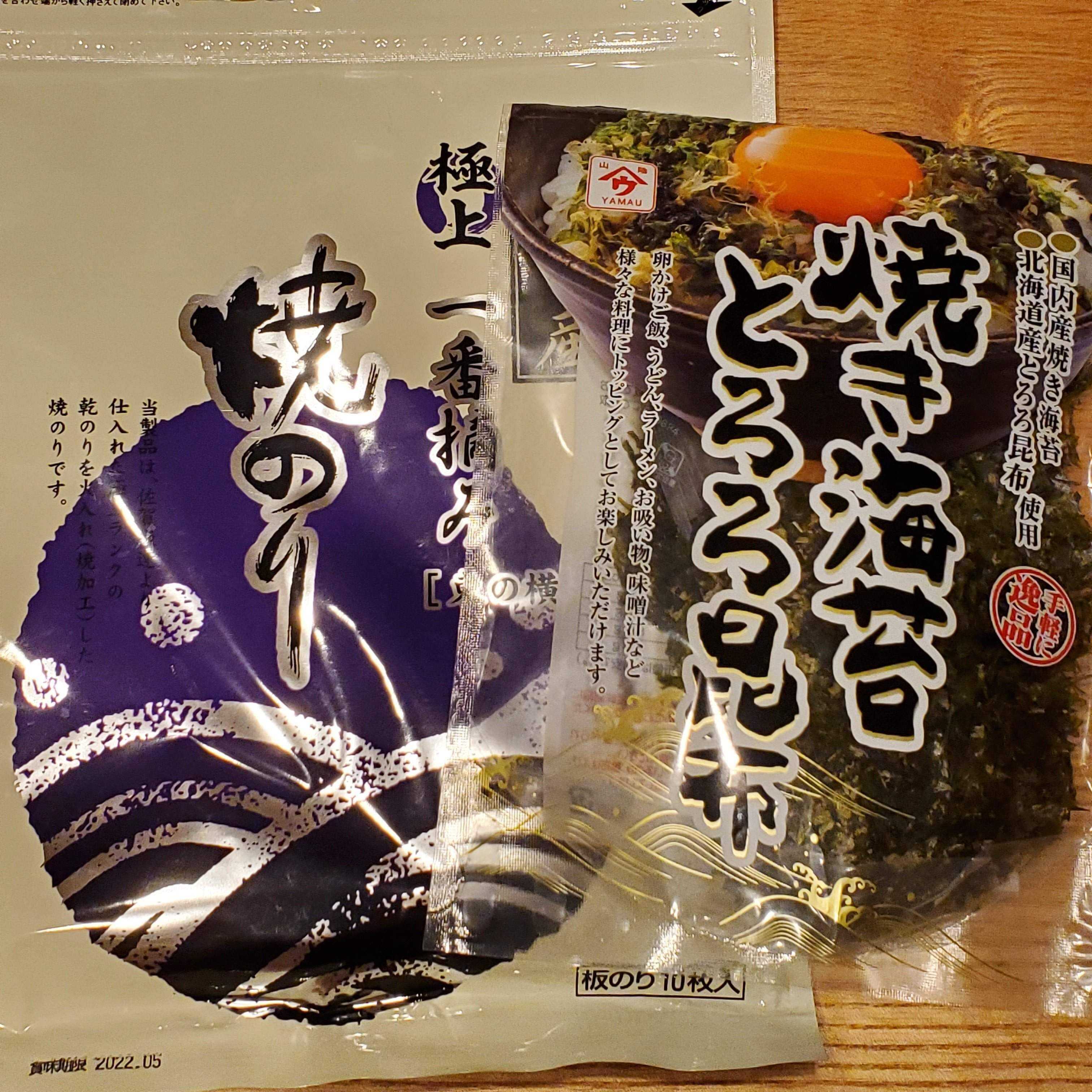 【海苔】「わ」の海藻。1枚ものからパラパラとふりかけ系までいろいろあります。韓国のりもおいしいけど油は多いのでご注意を。ちなみに、塩分はありますが、塩こんぶ等のこんぶ系もおすすめです。