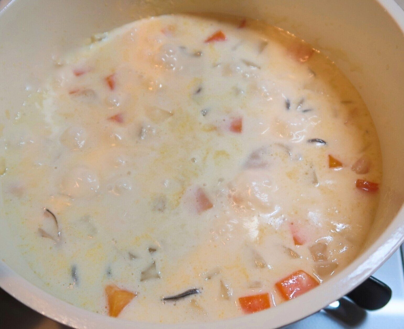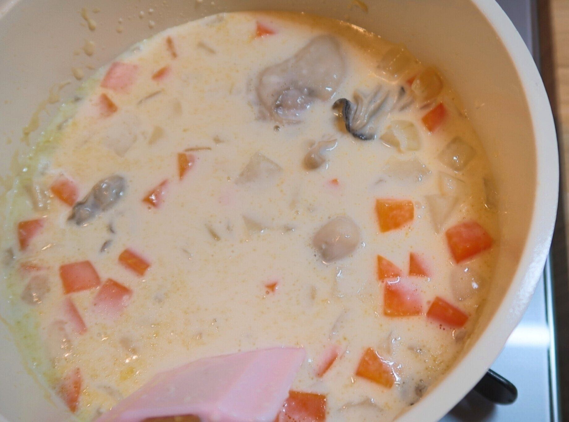 かきと野菜の旨味が溶け込んだ、具だくさんのチャウダー。旬の味覚をたっぷり味わえる一品です!かきがおいしい今の時期に、ぜひ一度つくってみてくださいね。