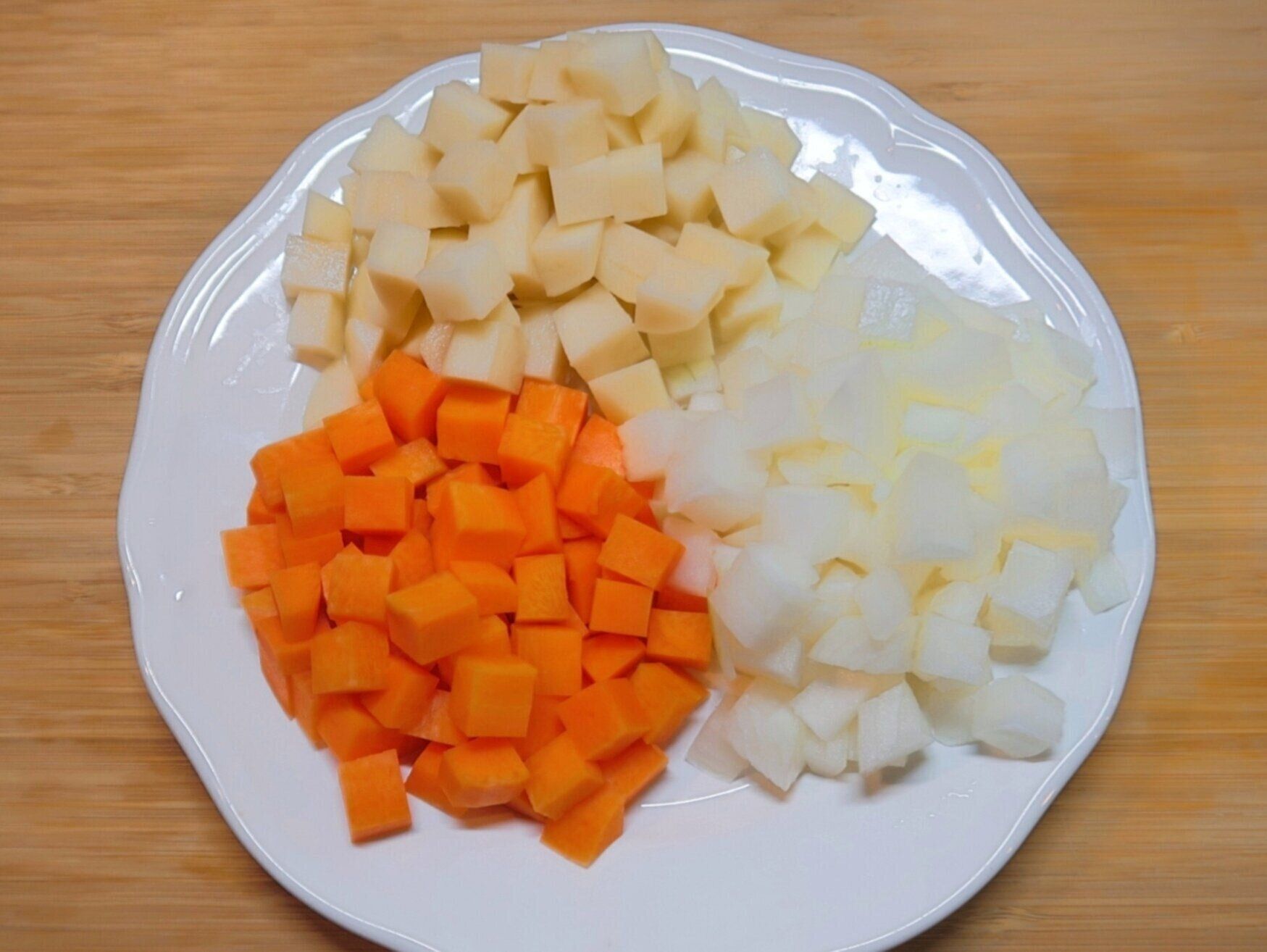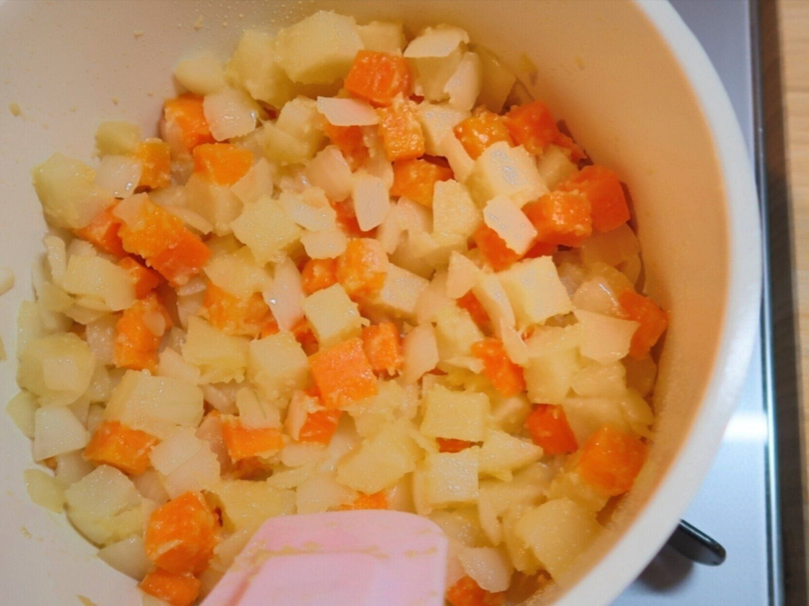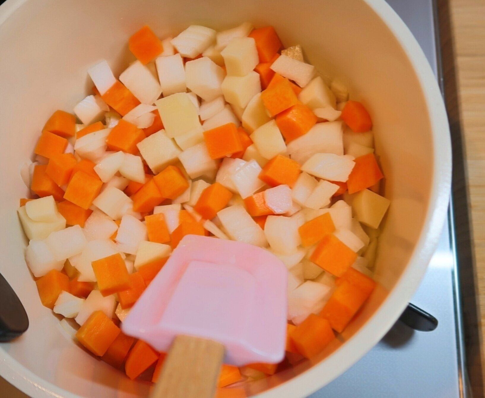 鍋にバターを弱めの中火で熱し、カットした野菜を約5分炒めます。じっくり炒めることで、野菜の旨味を引き出します!