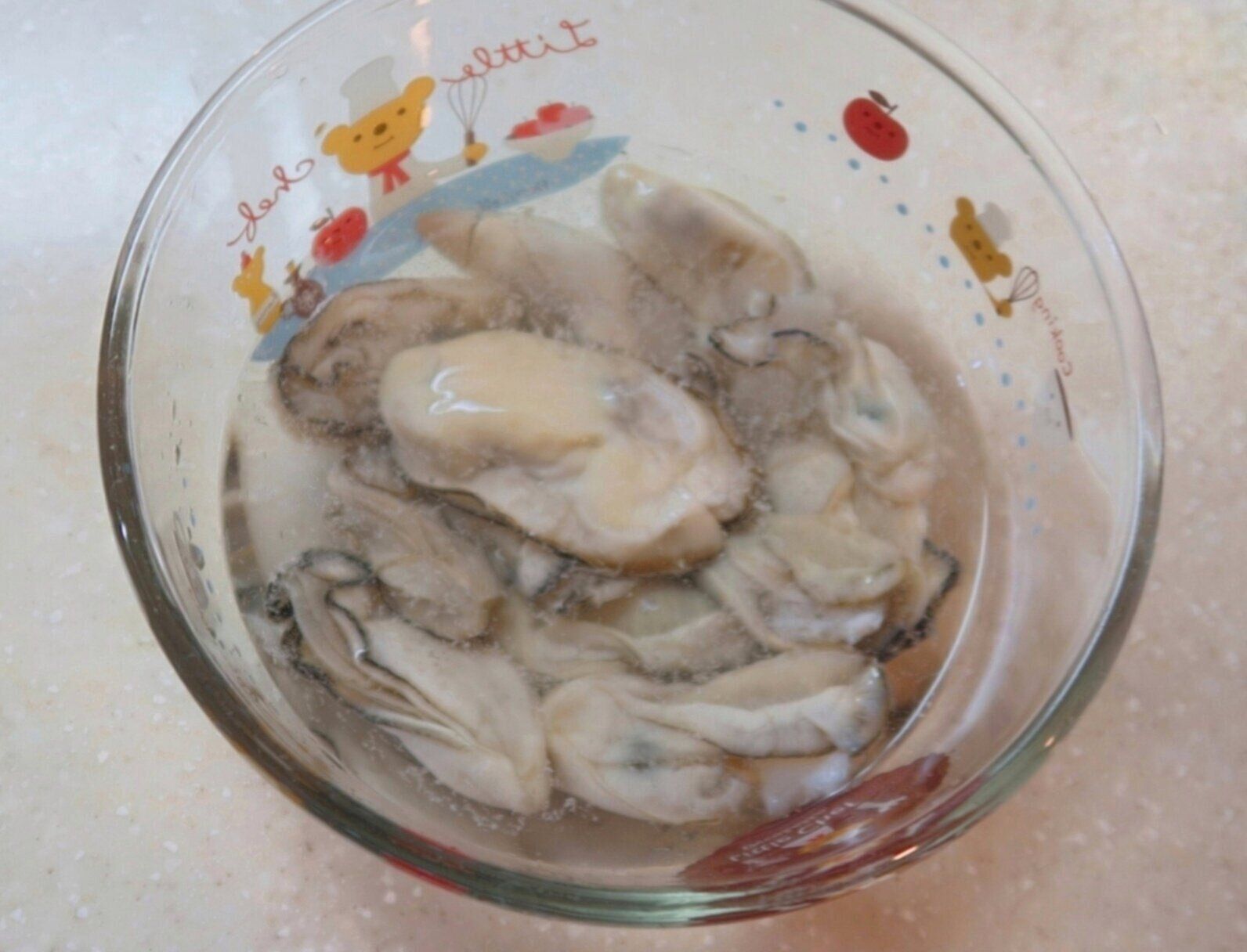 ボウルにかき、塩(小さじ2)、かきがかぶる位の水(分量外)を入れ、手でやさしく洗います。つづいて水ですすぎ、キッチンペーパーで水気をよくふき取ります。