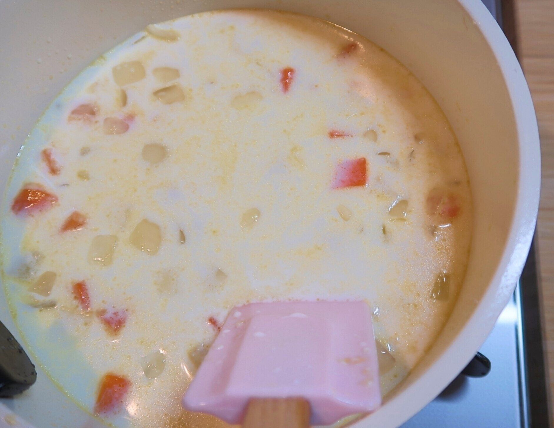 具材がやわらかくなったら味見をして、塩、こしょうで味をととのえます。味が濃い場合は少量の牛乳を加えて調節します。