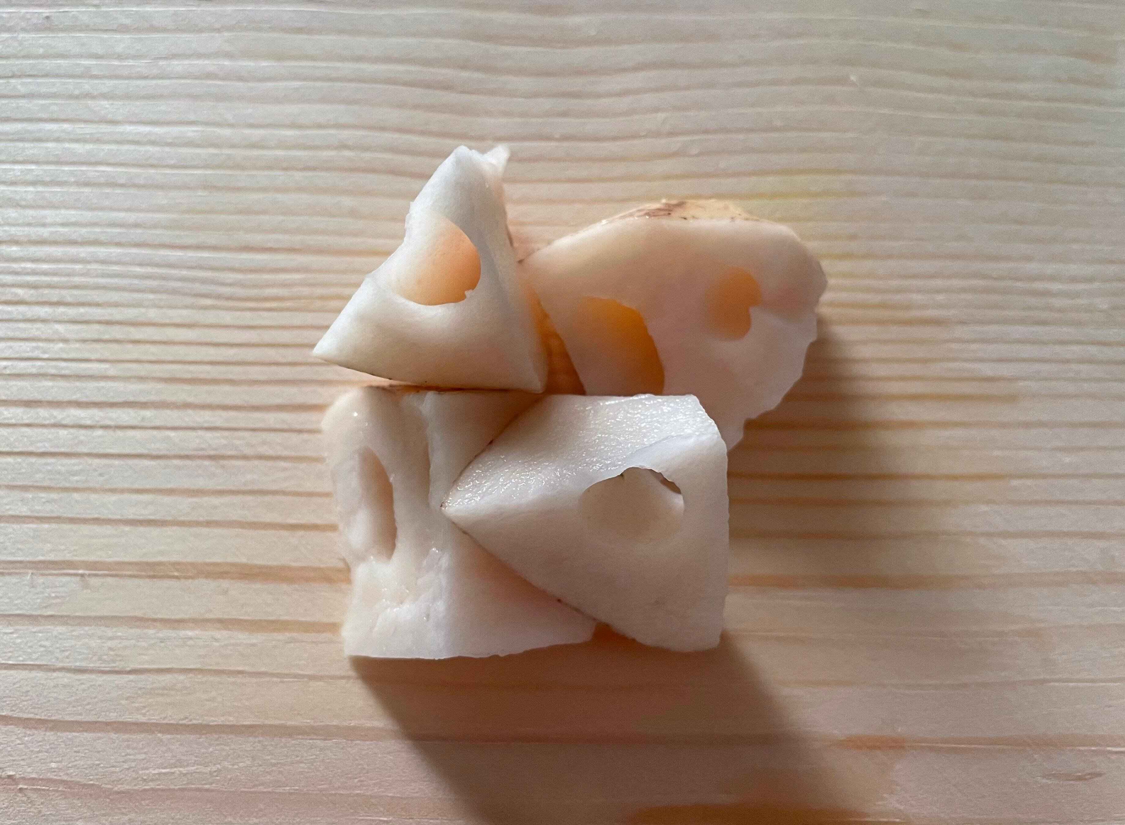 レンコンの乱切りは見慣れないかもしれませんが、ゴロッと存在感を出したい時にはおすすめです。