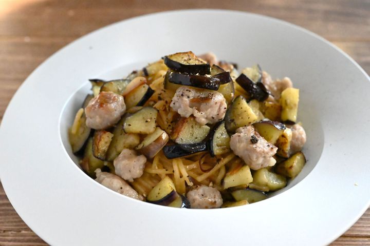 お酒にぴったり♪なすと生ソーセージのぺペロンチーノ