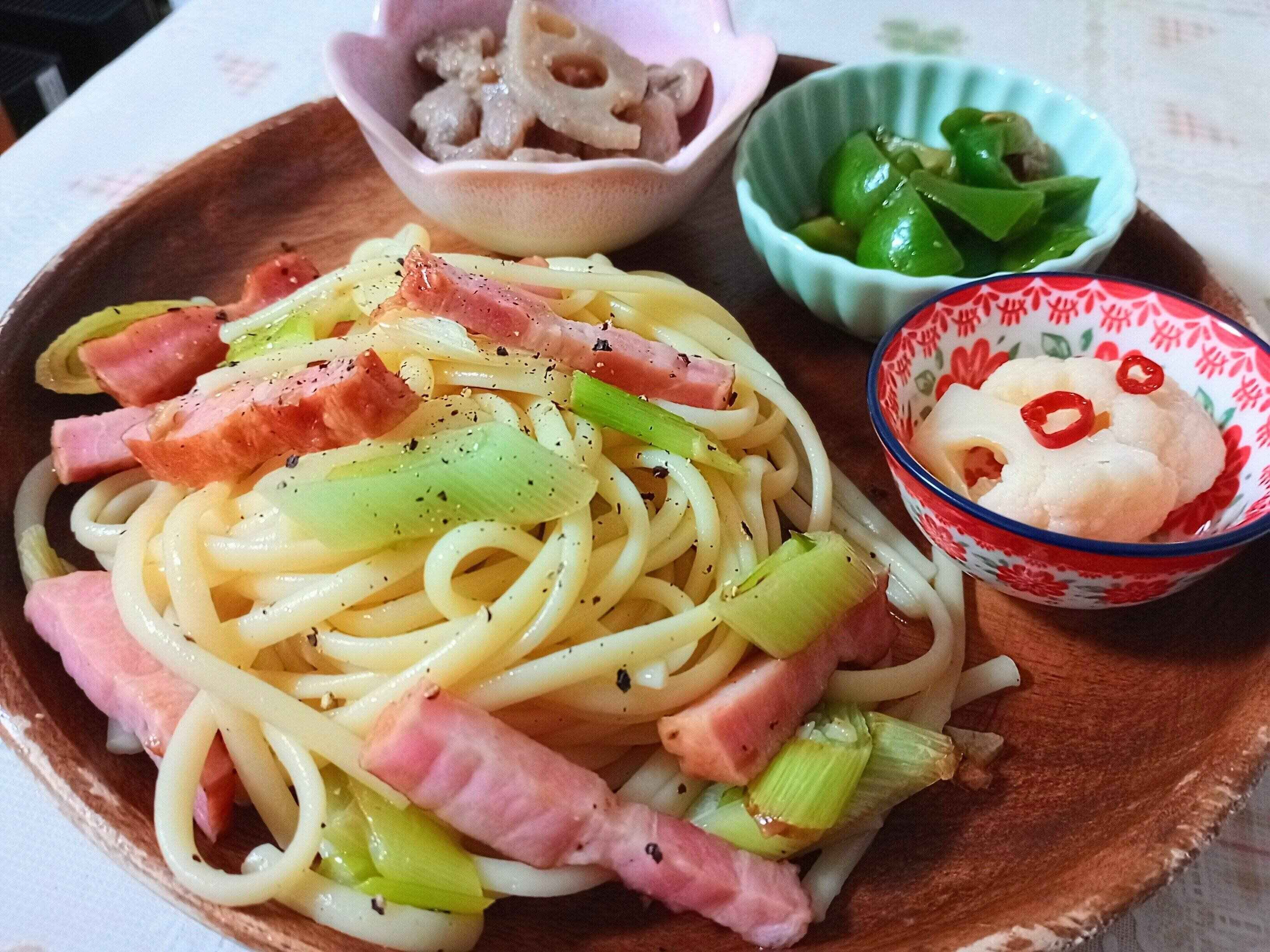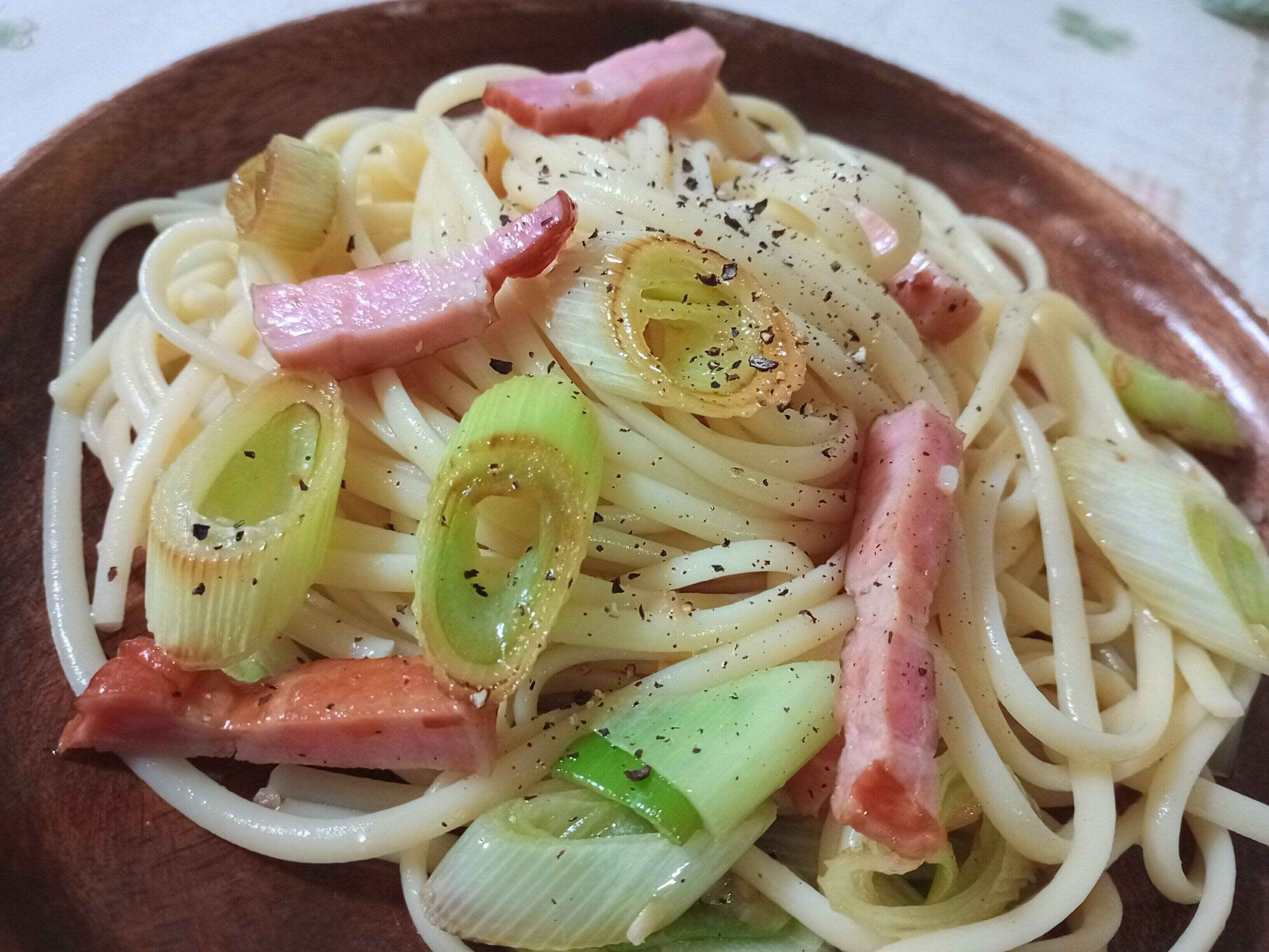 長ネギとベーコンのガーリックパスタ