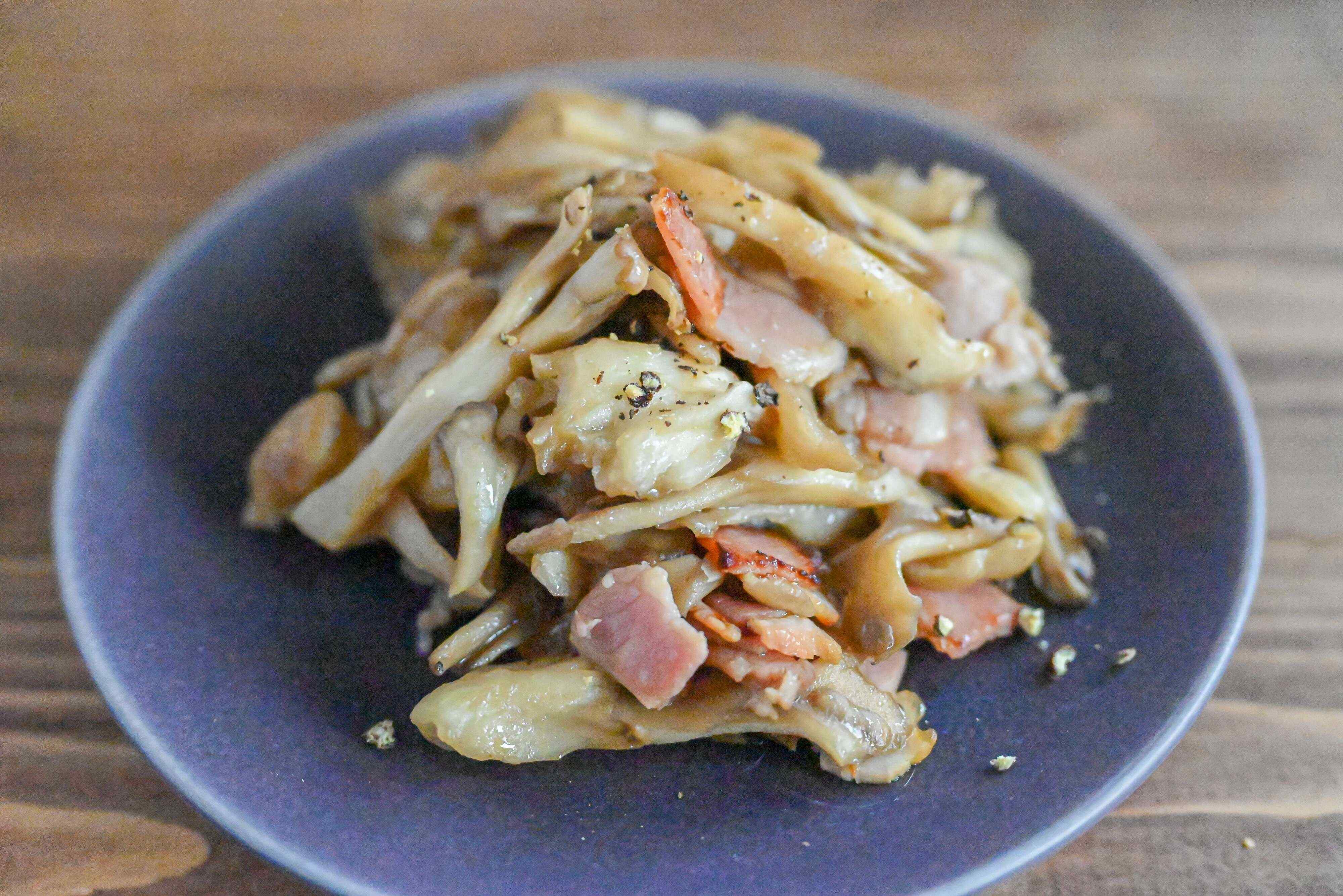 (1)舞茸は食べやすい大きさにほぐし、スライスベーコンは1cm幅に切る。