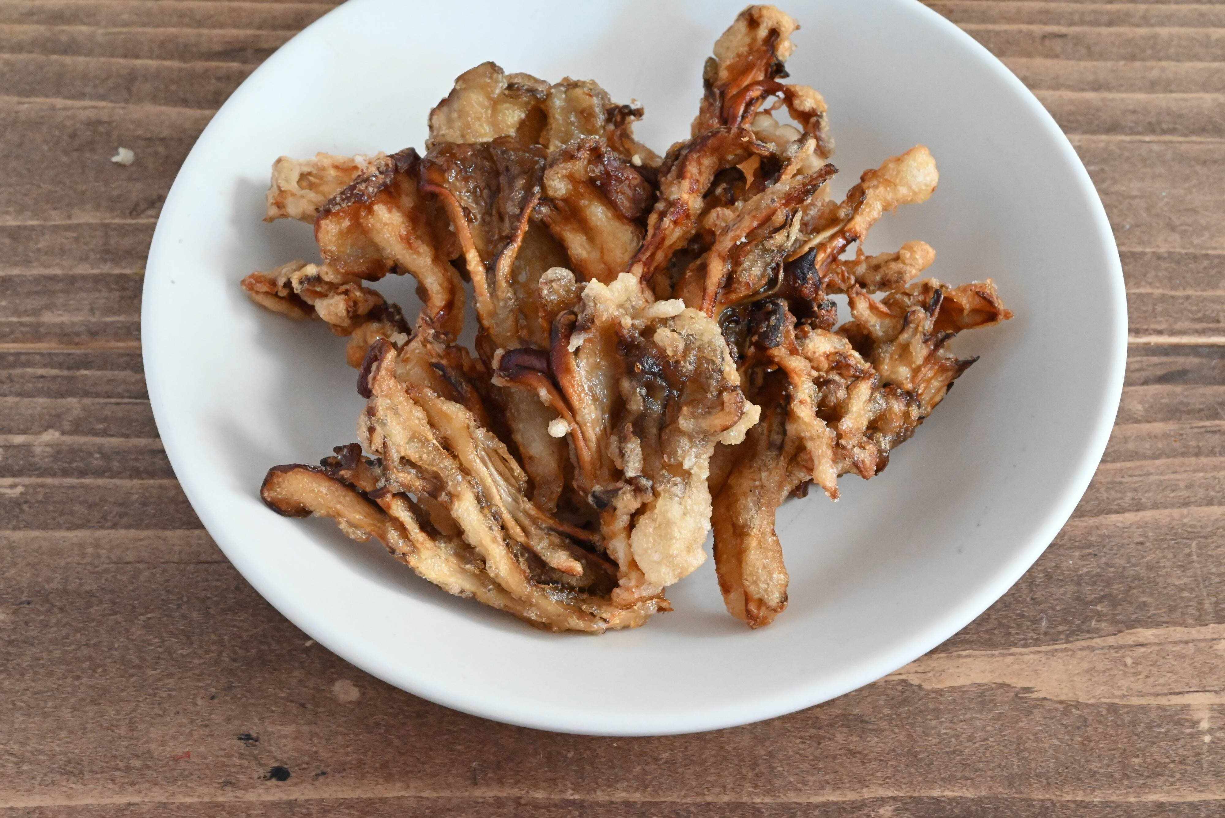 (3)フライパンの底から1cmの高さまで揚げ油を入れて中火にかけ、舞茸がカリっとするまで揚げ焼きにして完成。