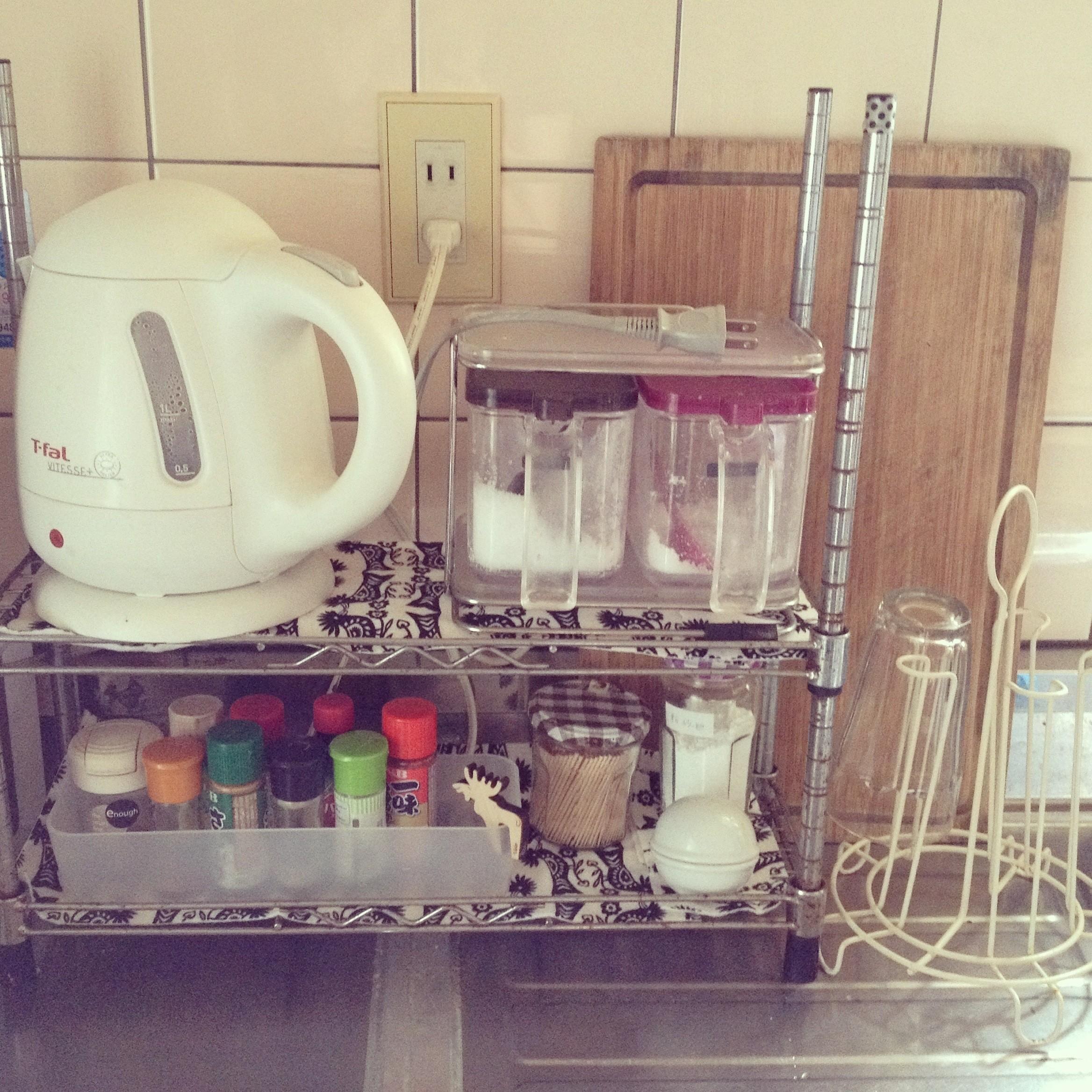 まな板やトレイを毎回どこかから取り出すのは面倒……という人は、棚の背後などにそっと立てかけておくのもよさそうです。こちらは、組み立て式ステンレス棚の後ろにトレイを置いています。