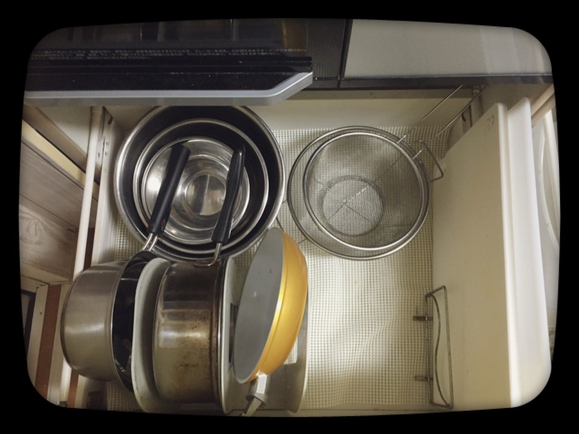 サンキュ!ブロガーMIYUさんは、お鍋やフライパンが収納されたキッチンの引き出しの端っこにあるちょとしたスペースへまな板をIN。引き出しに高さがあれば、こういった収納もできます。