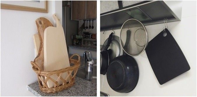 こちらは吊るすに加えて、冒頭で紹介した見せる収納も取り入れたアイデア。セリアで購入した吊り下げラックをキッチンの壁際に設けて、そこにまな板を収納しています。