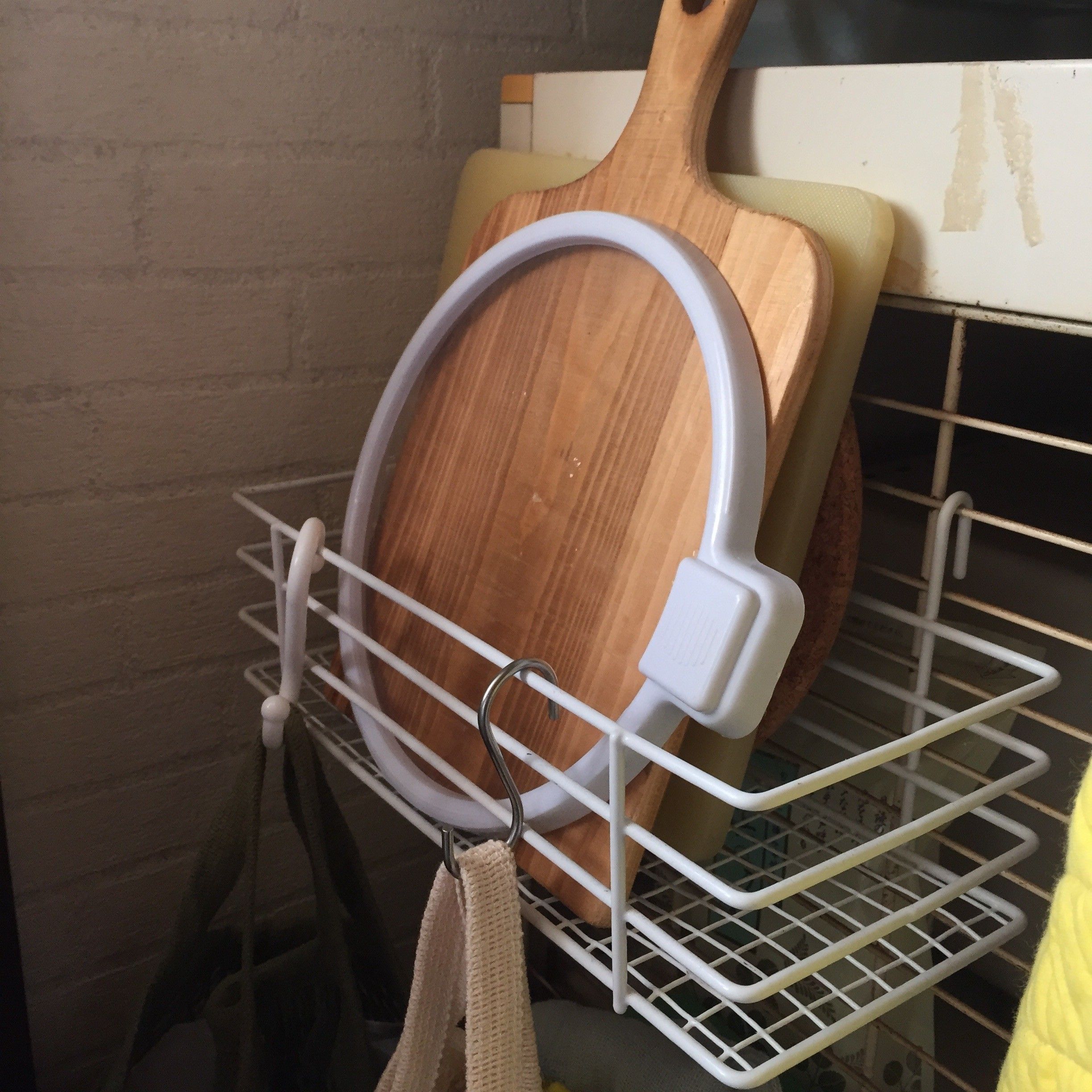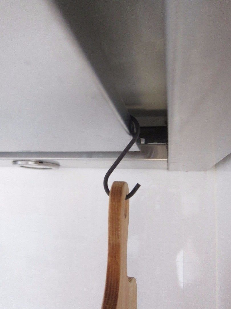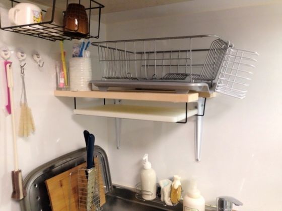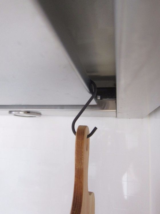 さきほどご紹介したさくらさんが、“見せる”前にやっているのが“吊るし”。100均ショップで購入したS字フックで、換気扇の近くにまな板を吊るすことで、効率的に乾燥させられます。
