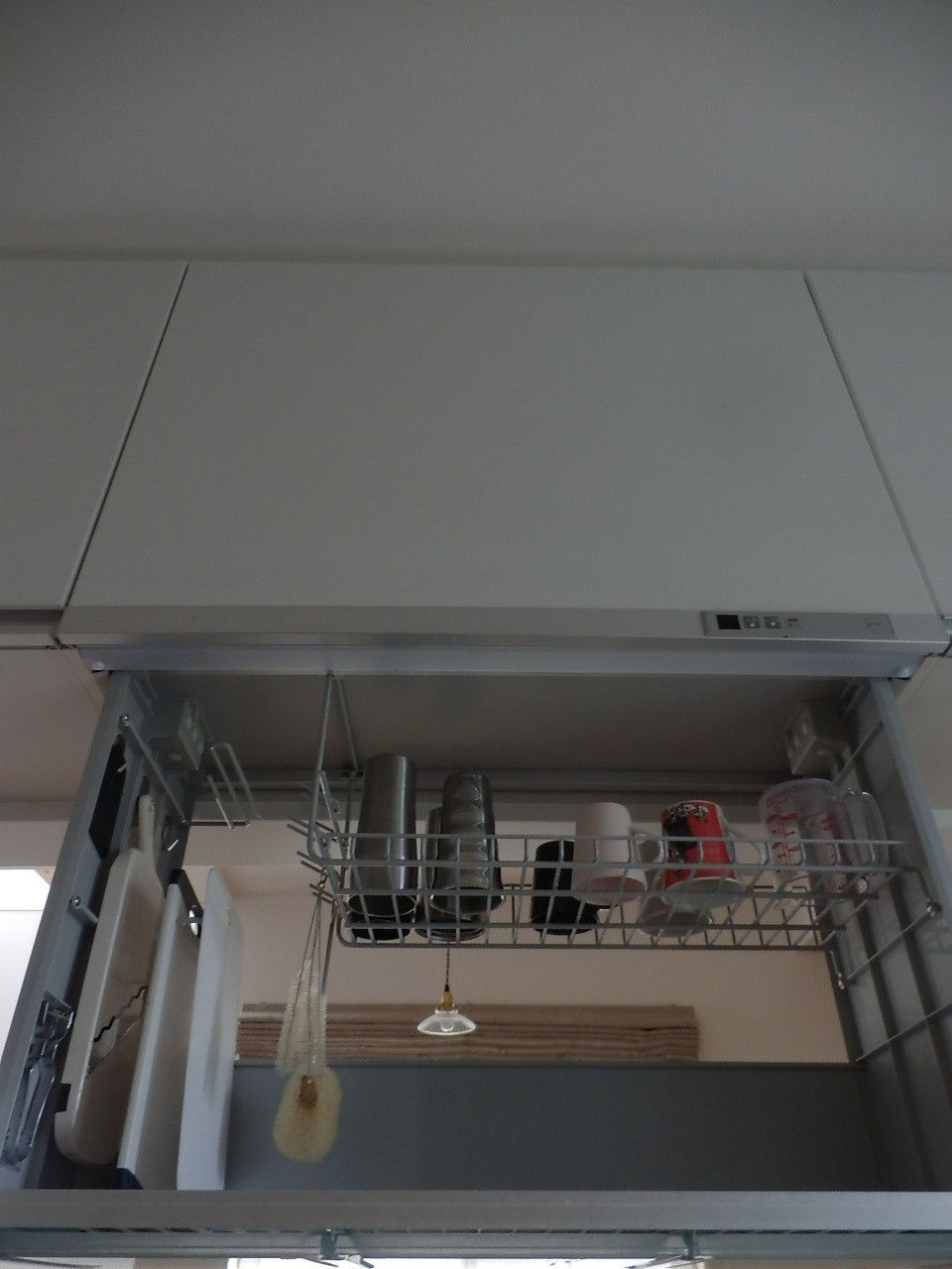サンキュ!ブロガー藤原絵美子さん宅のキッチンにある自動昇降式水切りカゴにも、まな板がピタリと収まりました。立てて収納するときは、サイズ感が重要かもしれません。