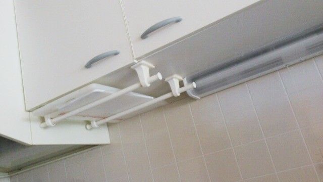 吊り戸棚の下に設置された、ジャストサイズのまな板収納スペース。こちら、じつは100均で購入したタオルハンガーを活用したもの。吊るし収納の応用編とも言えそうです。