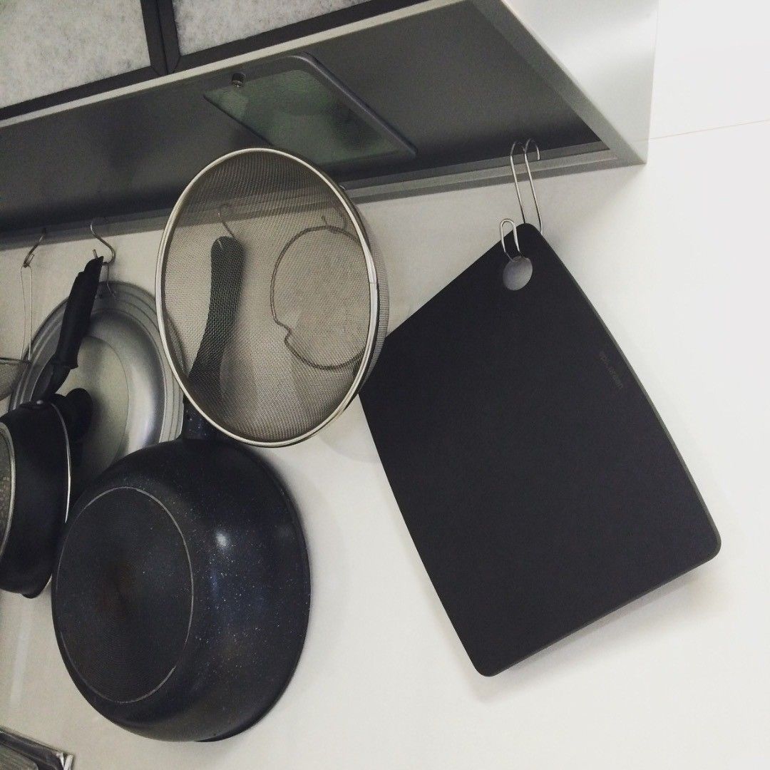 サンキュ!ブロガーナカムラマリコさんもまな板は吊るす派。引っ掛ける穴が設けられたアイテムをチョイスしています。黒のデザインが、いっしょに吊るしているフライパンとも調和し、統一感にあるルックスに。こちらも吊るす際には、S字フックを活用しています。