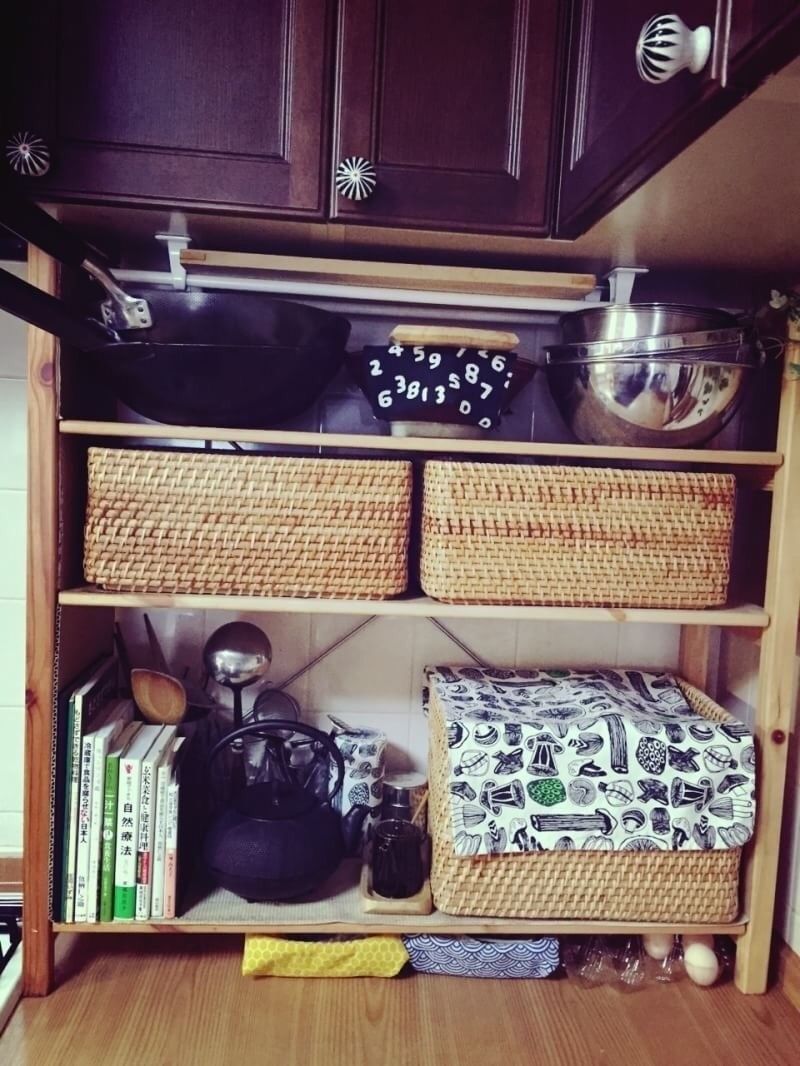 サンキュ!ブロガーみい太さんも、後ろにまな板やトレイをそっと収納。複数枚置いてもあまり目立たず、省スペースで圧迫感もないのでスッキリした印象になります。