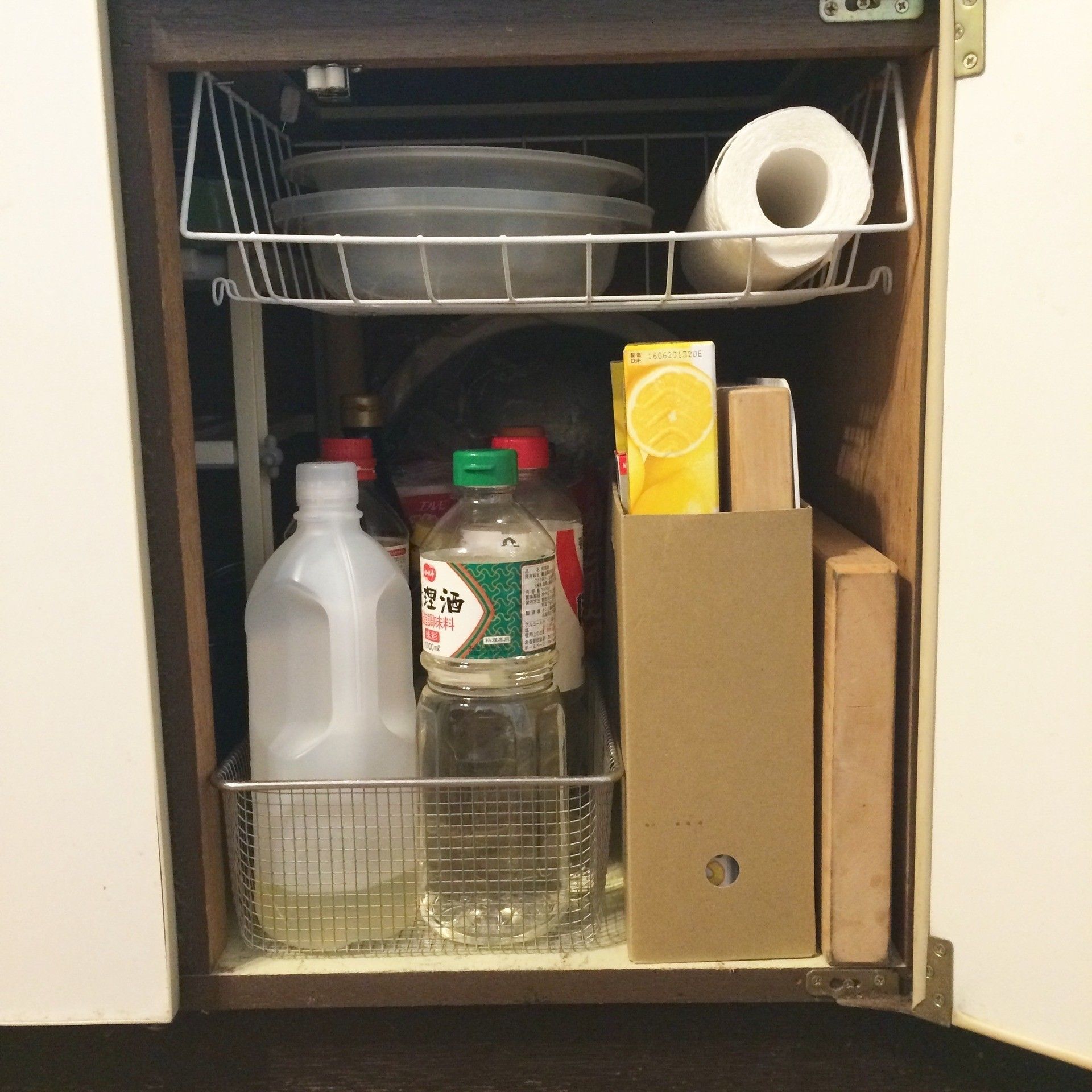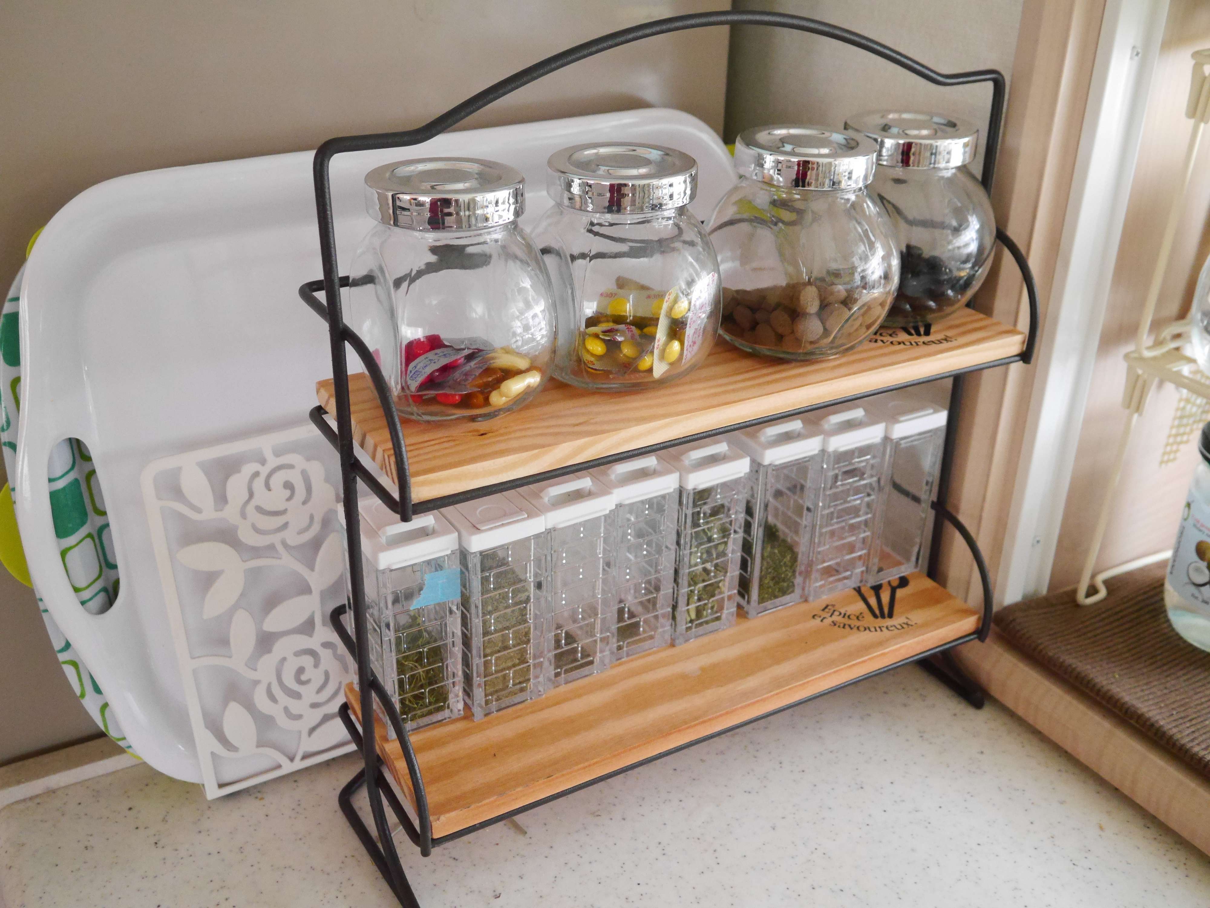 同じくセリアのアイテムから、サンキュ!ブロガーHitomiさんはアイアンバー2本を利用してまな板の収納スペースを確保。ちなみに、アイアンバーのサイズがピタリと合うように、上部にある板の長さも少し調整しているんだとか。