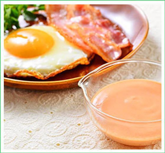 ビヒダスプレーンヨーグルト30g(カレースプーン1杯程度)に、トマトケチャップ(大さじ1)、にんにくすりおろし(少々)と塩(少々)を入れて混ぜるだけ。マヨネーズを使うより、さっぱりヘルシーに仕上がるのがポイント。目玉焼きやエビフライ、ハンバーグなどにおすすめです。