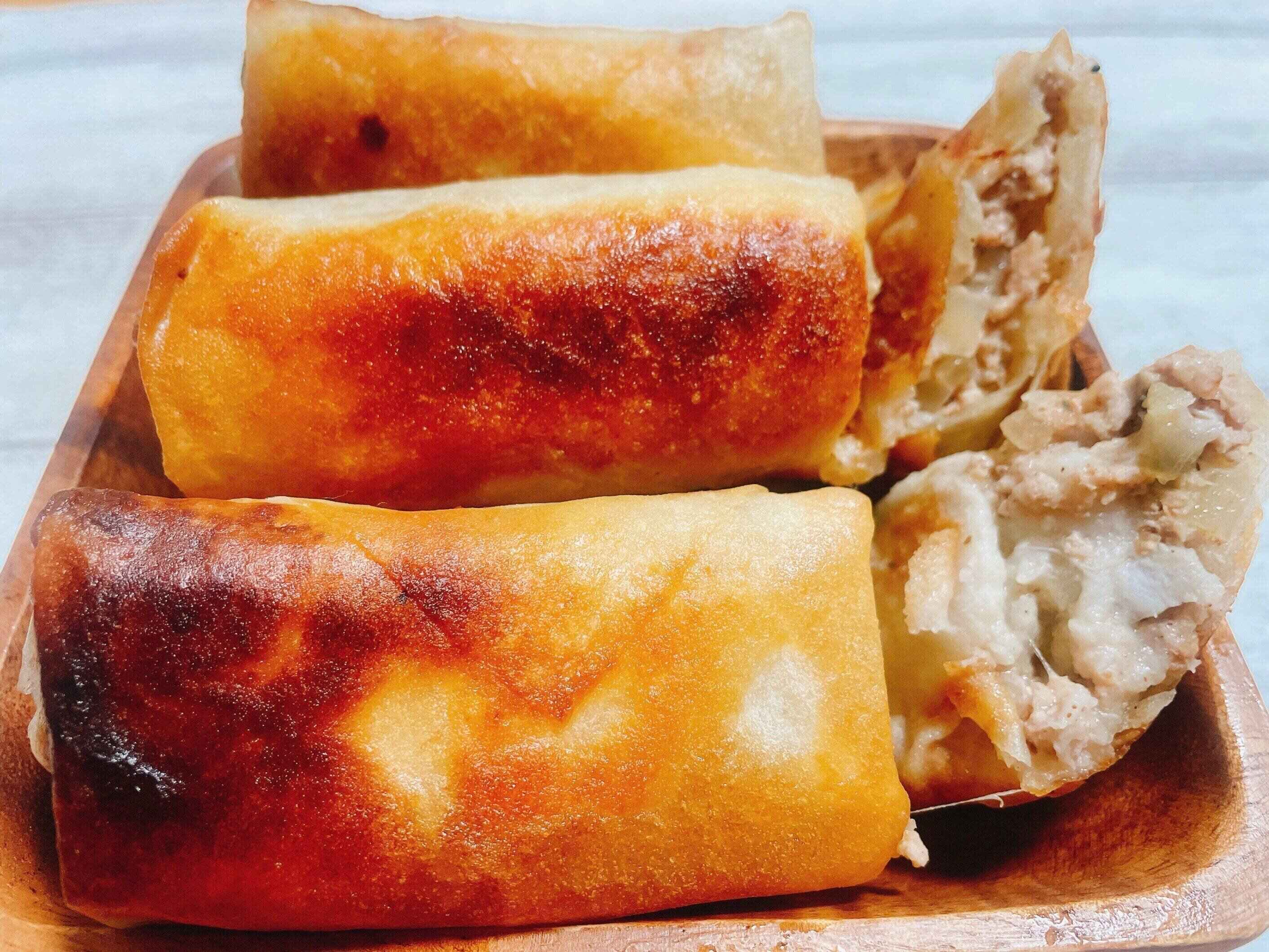 3.2に1を加え混ぜ合わせたら、10等分して春巻きの皮で包みます。