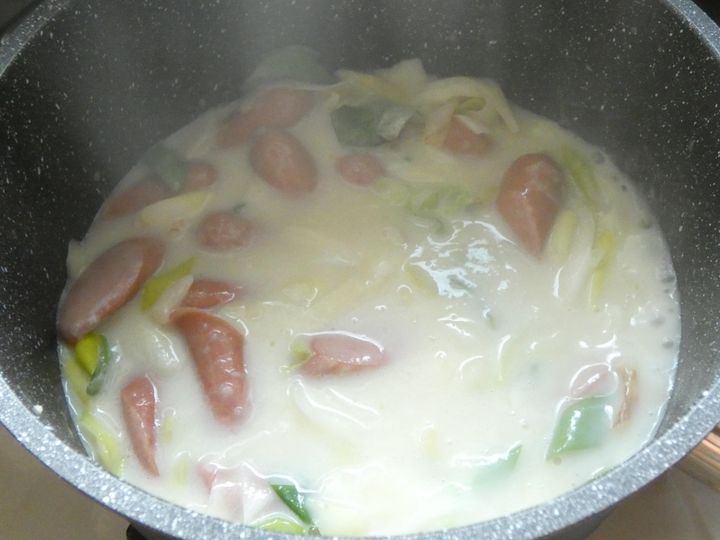 4.粉っぽさがなくなったら牛乳、塩こしょうを入れて煮ます。