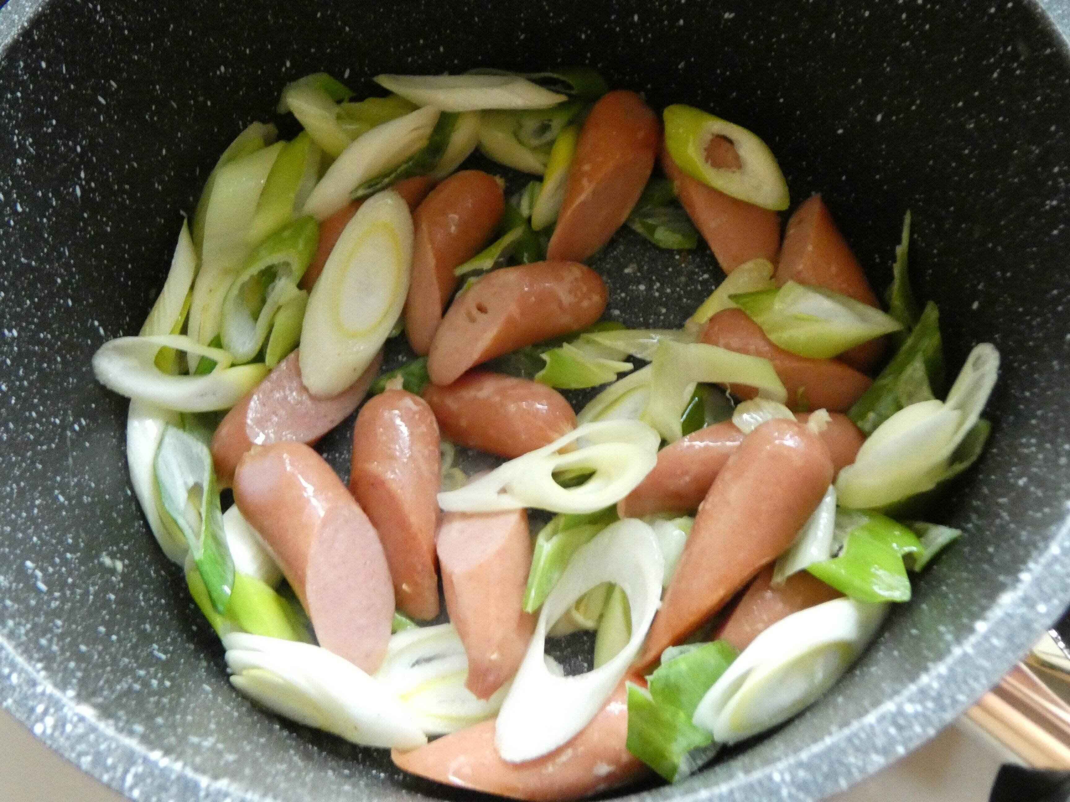 2.鍋にバターとウィンナー、ネギを入れて炒めます。