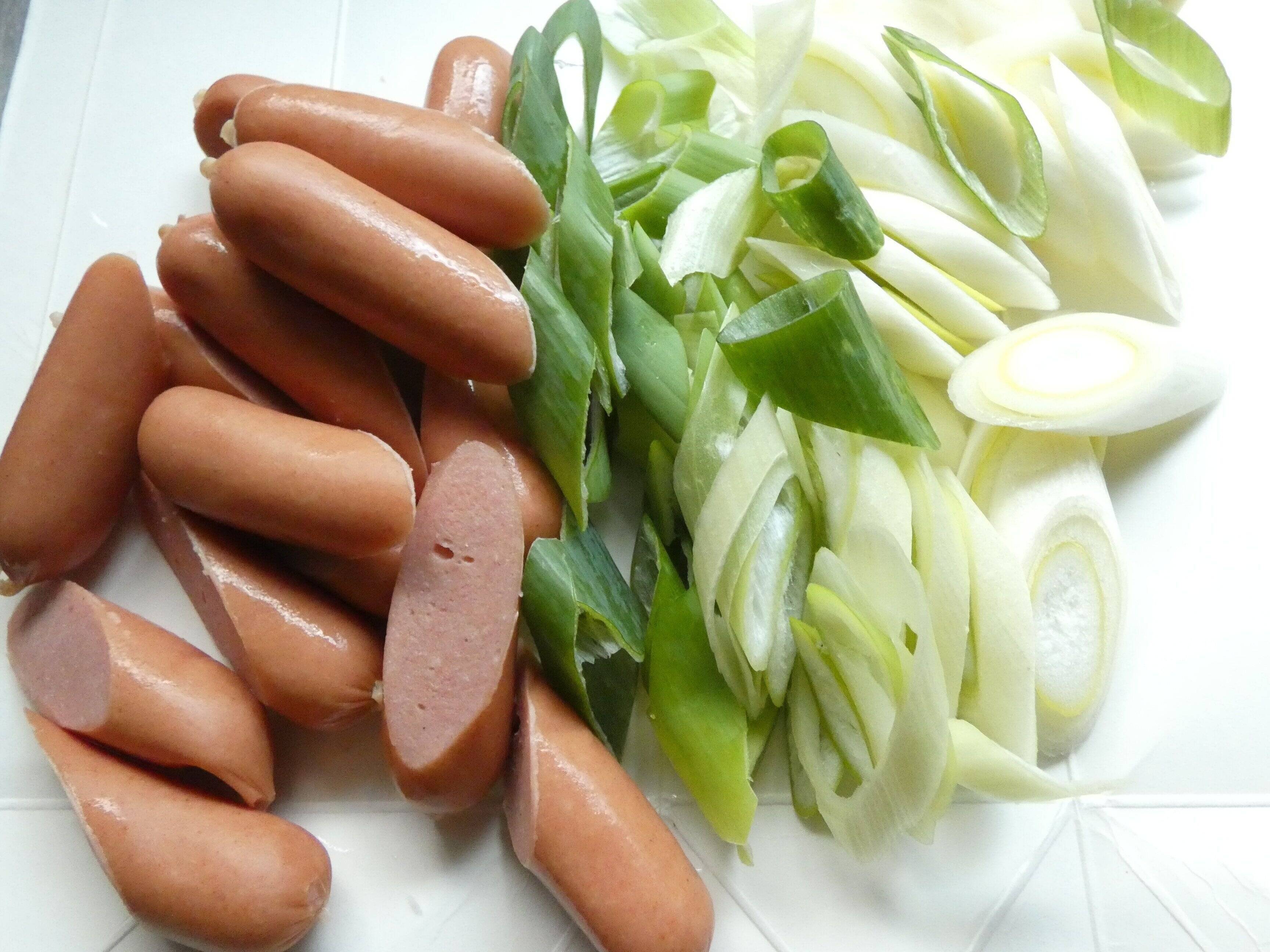 1.ウィンナーは斜めに半分に切り、ネギは斜め切りにします。