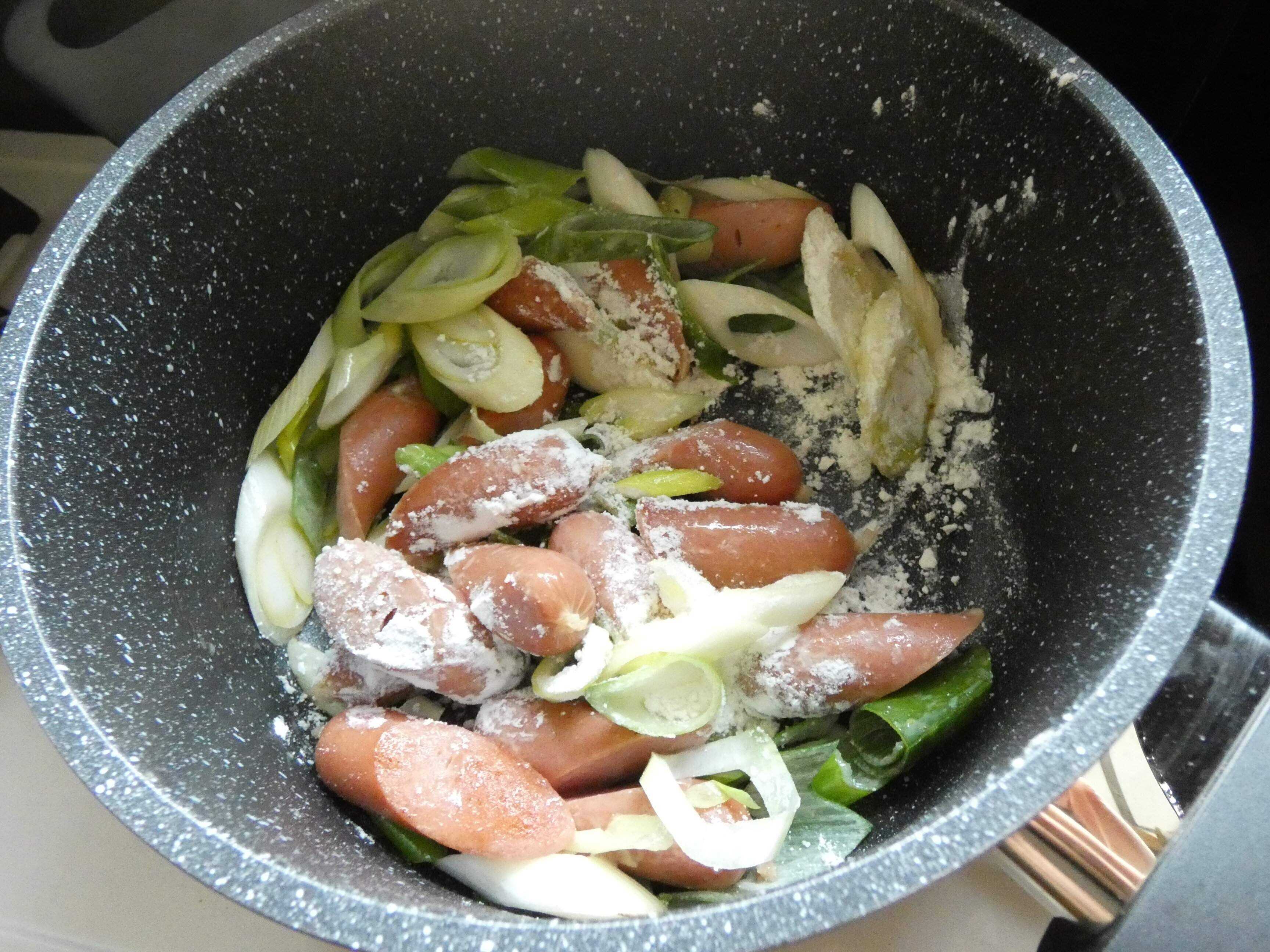 3.ネギがしんなりしてきたら、薄力粉を入れてよく炒め合わせます。