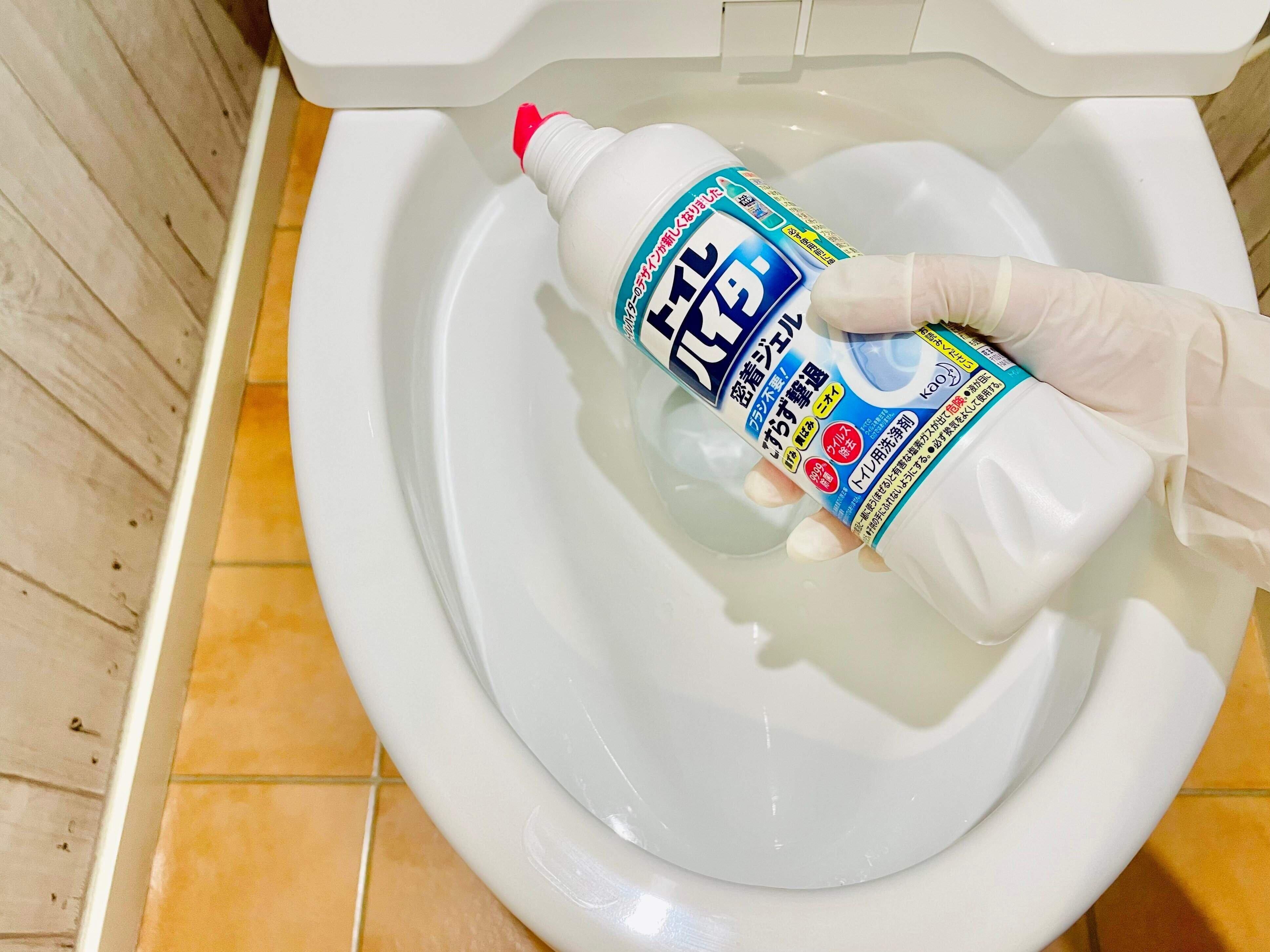 花王【トイレハイター】をぐるっと一周かけたら、2~3分置いて流すだけ。トイレブラシを使わなくてもピカピカ!除菌までしてくれます。