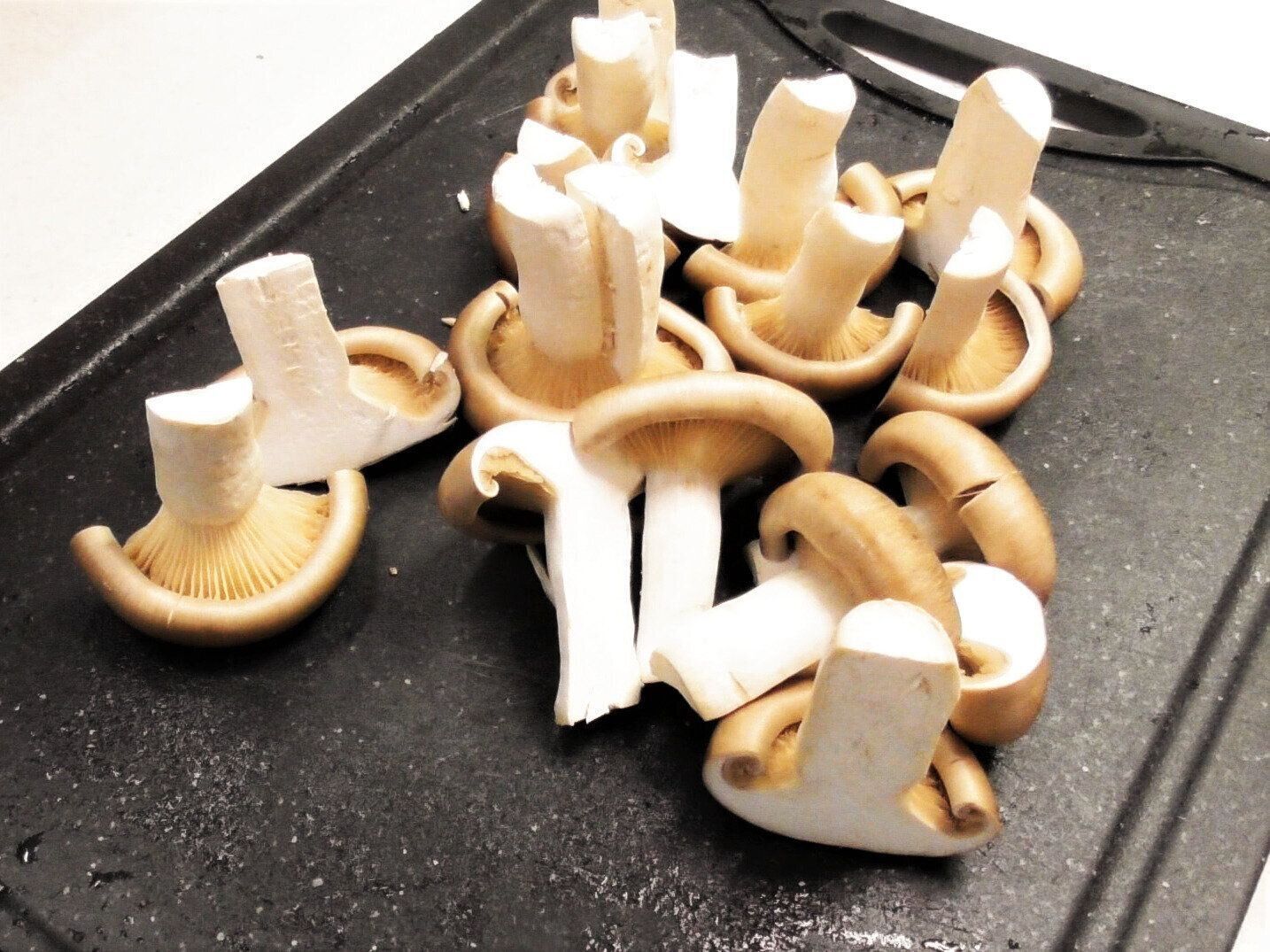 [2].大黒本しめじの石づきを切り落とし、縦半分に切る。