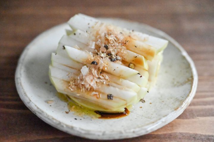(2)オリーブオイル、醤油をかける。食べる直前にブラックペッパー、かつお節をかけて完成。