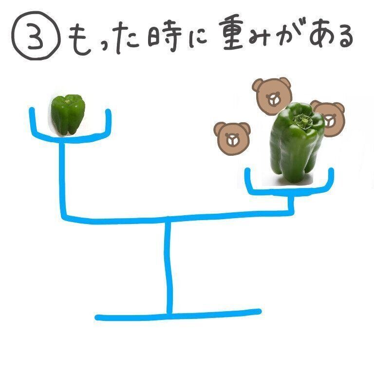 ピーマンは古くなってくるとタネから腐敗し始めたり、水分が抜けてしまったりするのでできるだけ重さがあるものを選びましょう。