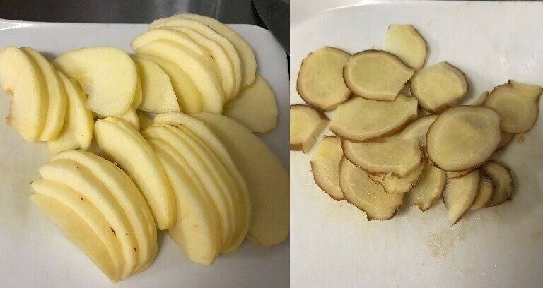(1)りんごは皮をむいて、生姜は皮をむかずに薄切りをする