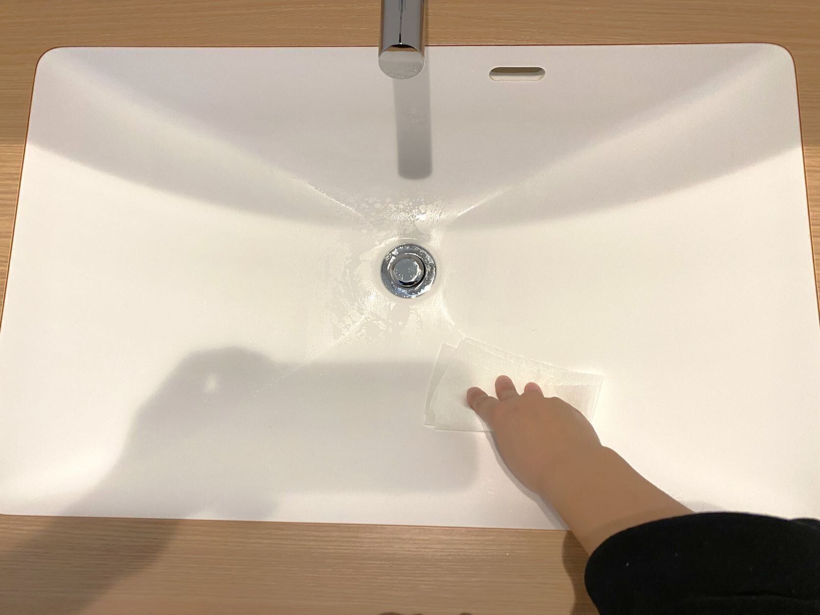 先ほどは拭き取ってから3分程度待ち水を流しましたが、今度は30分水を使わず放置してみました。