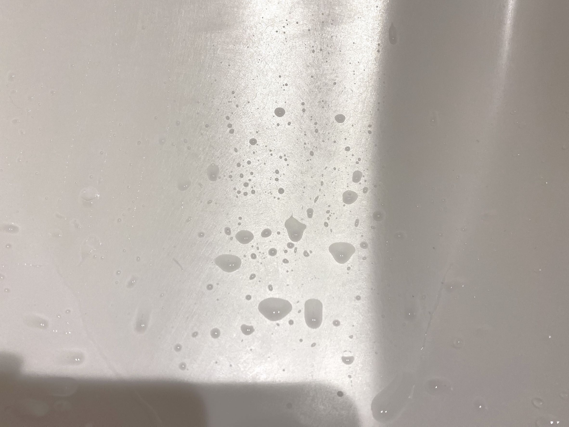 弾いていますね。水弾きが見たくてすぐ水を流してしまいましたが、やはりしっかり乾かしてから流した方がよさそうです。もしくは、2回コーティング剤を使用したお陰かもしれませんね。