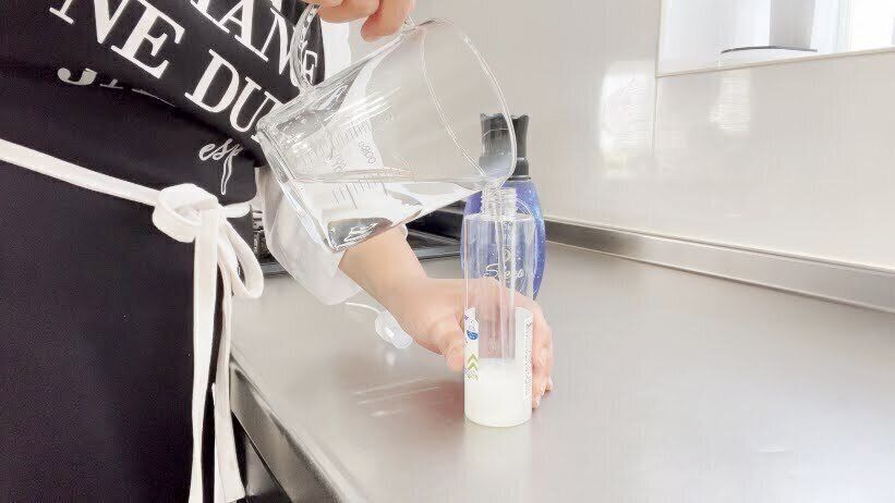 スプレーボトルに、水200mlと柔軟剤5ml(小さじ1)を入れてよく混ぜます。