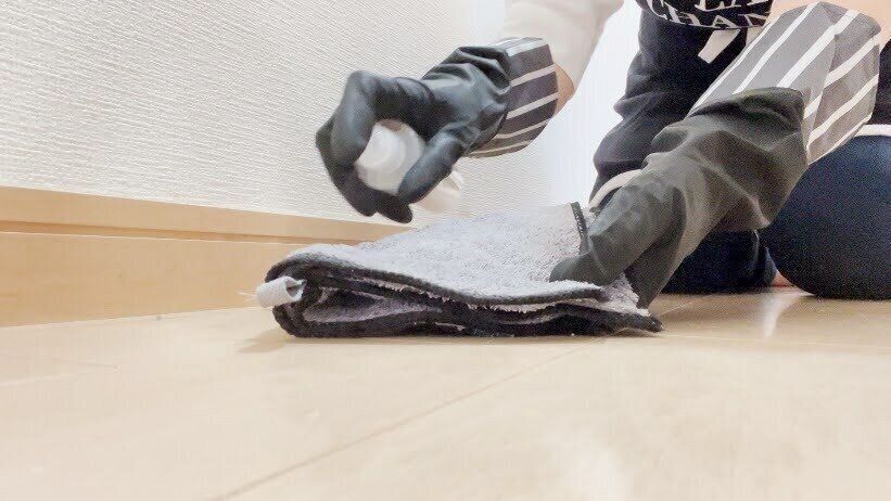 ホコリよけスプレーを布に塗布し、巾木の上をすべらせて拭きます。