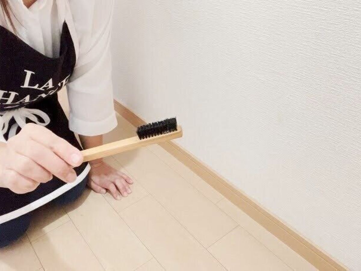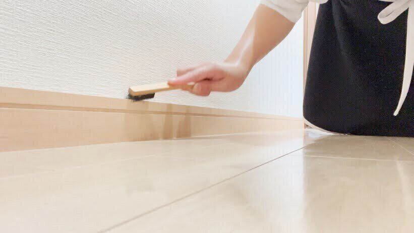 ここは水気のあるものは使わず、巾木にそってブラシでこすりながらホコリを落としていきましょう。