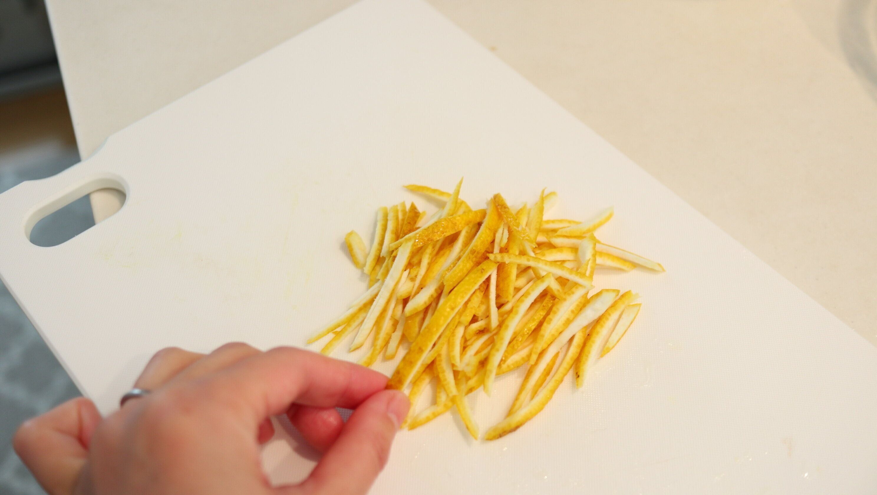 柚子の皮は、白い綿部分に苦みがあるので包丁で削ぐようにカット。