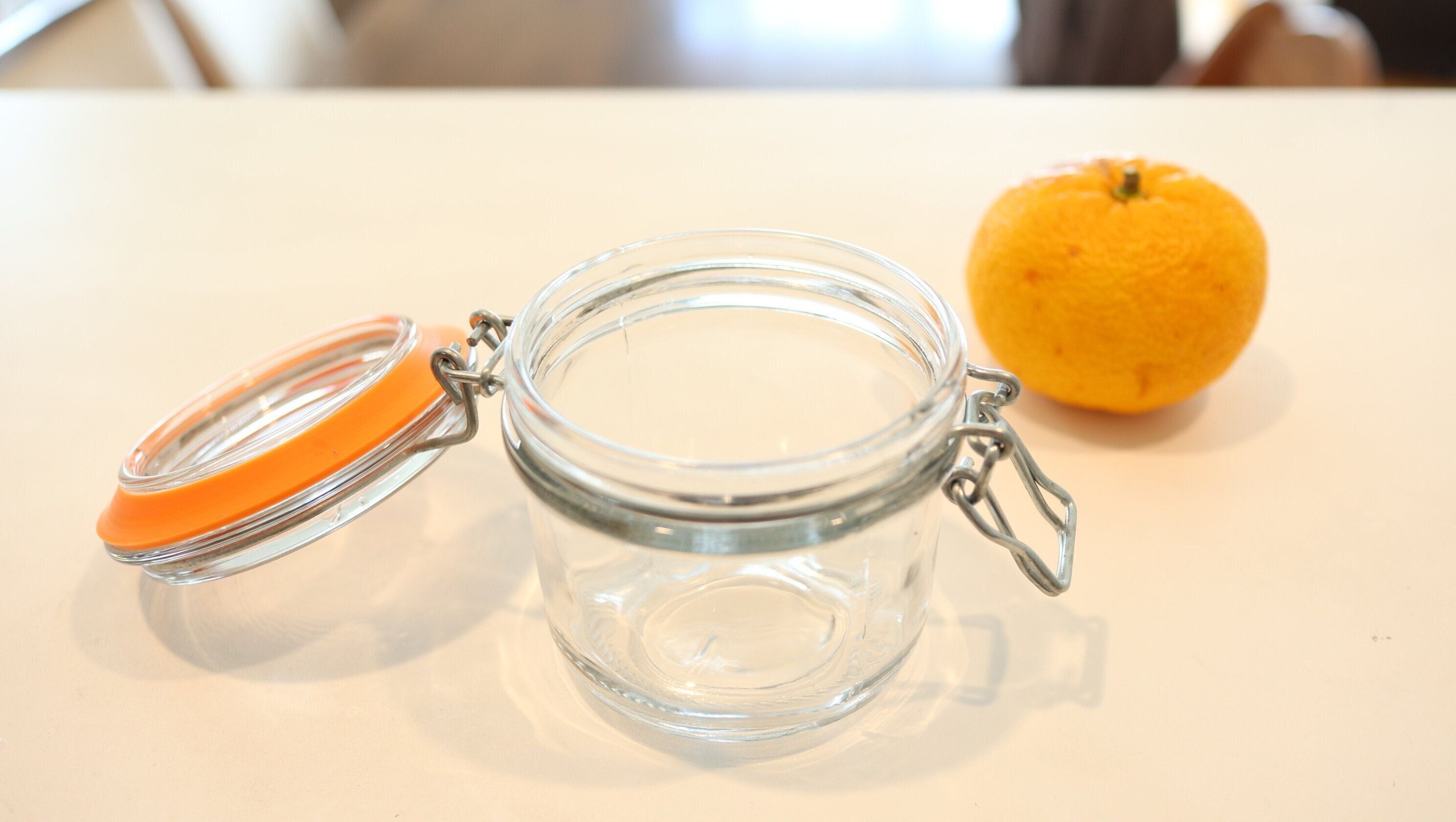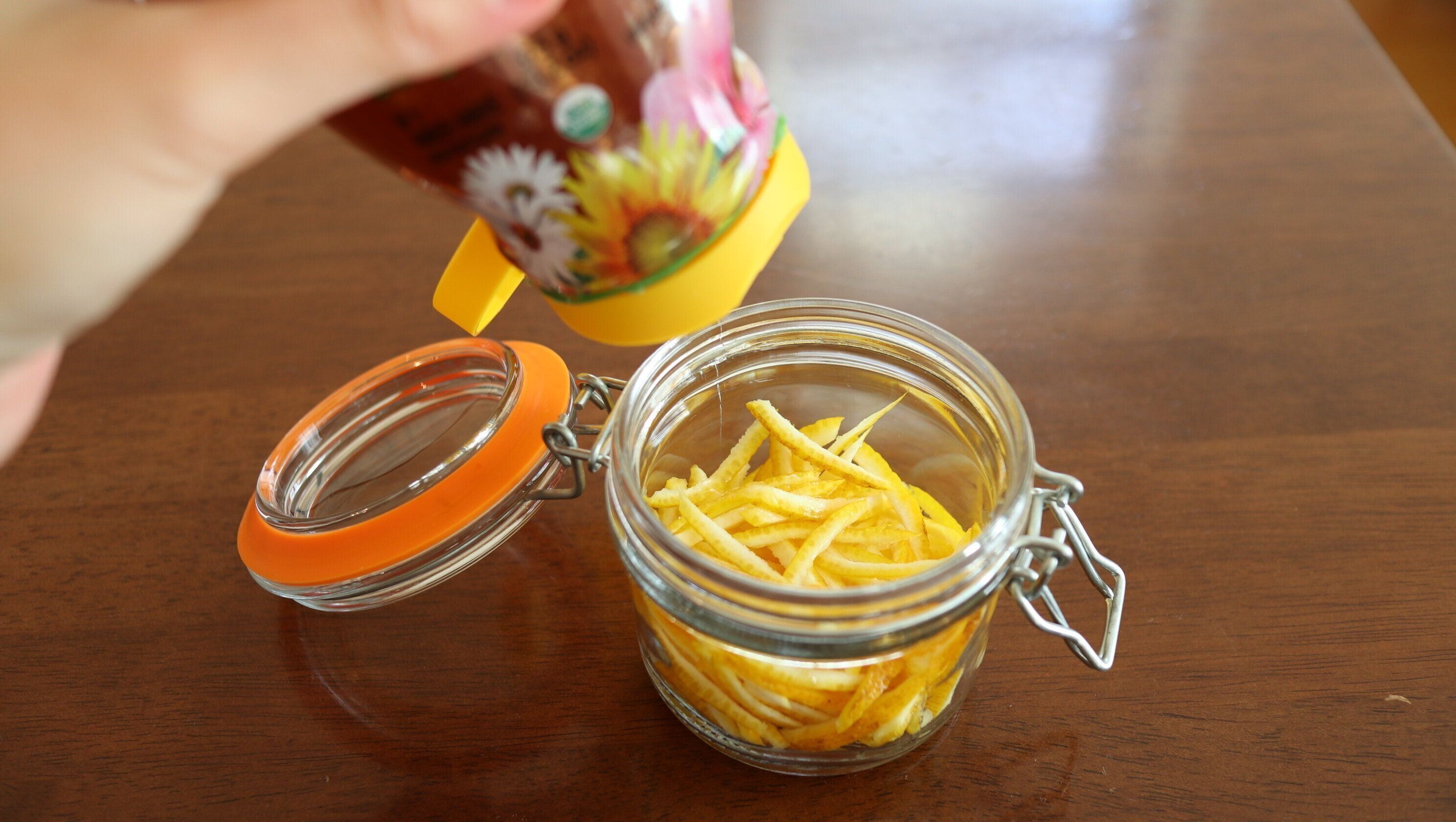 熱湯消毒した保存容器に千切りにした皮を入れ、絞った果汁を入れます。