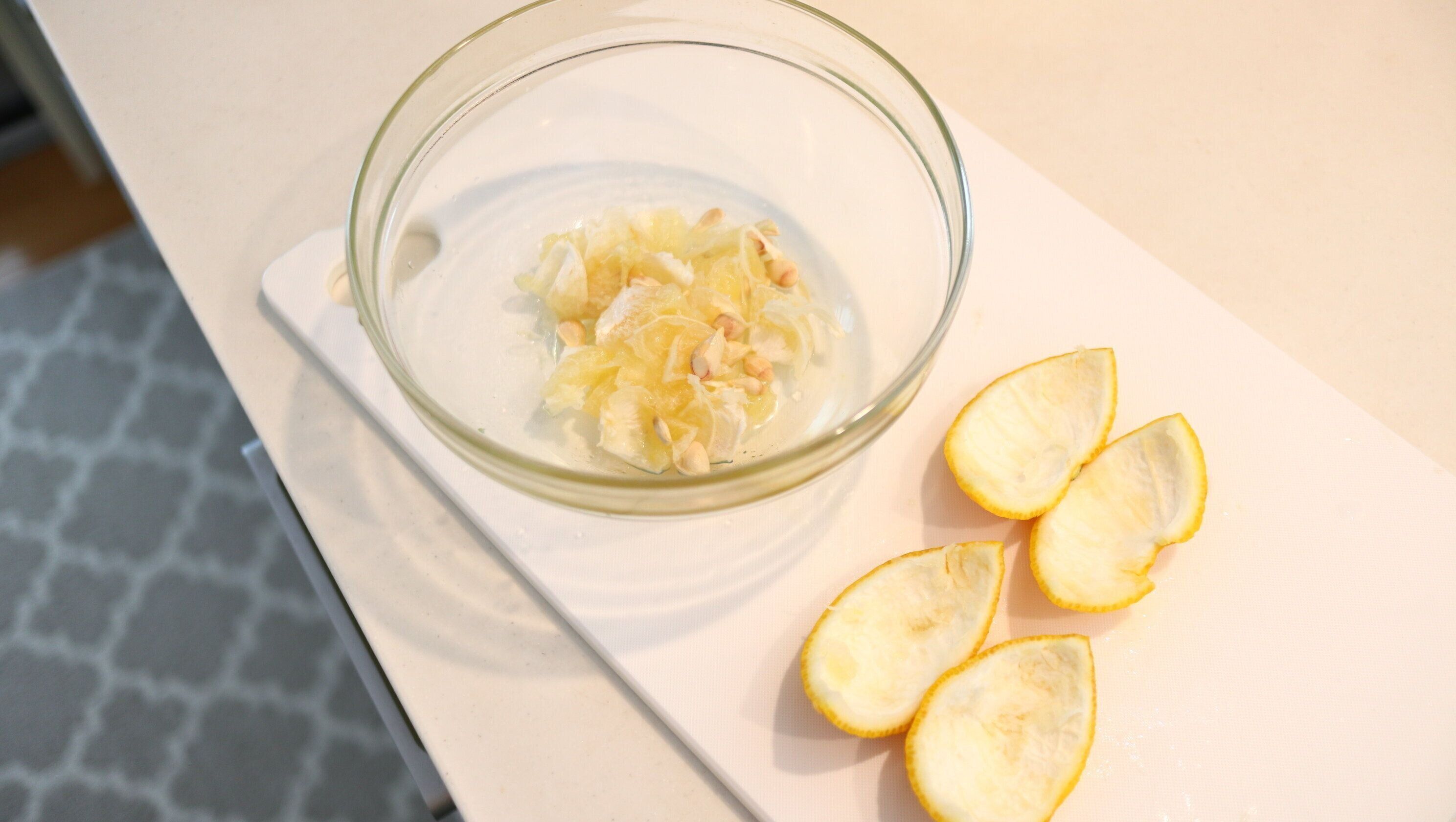 柚子皮と果肉を分けます。果汁はシロップに使うので、絞っておいてくださいね。