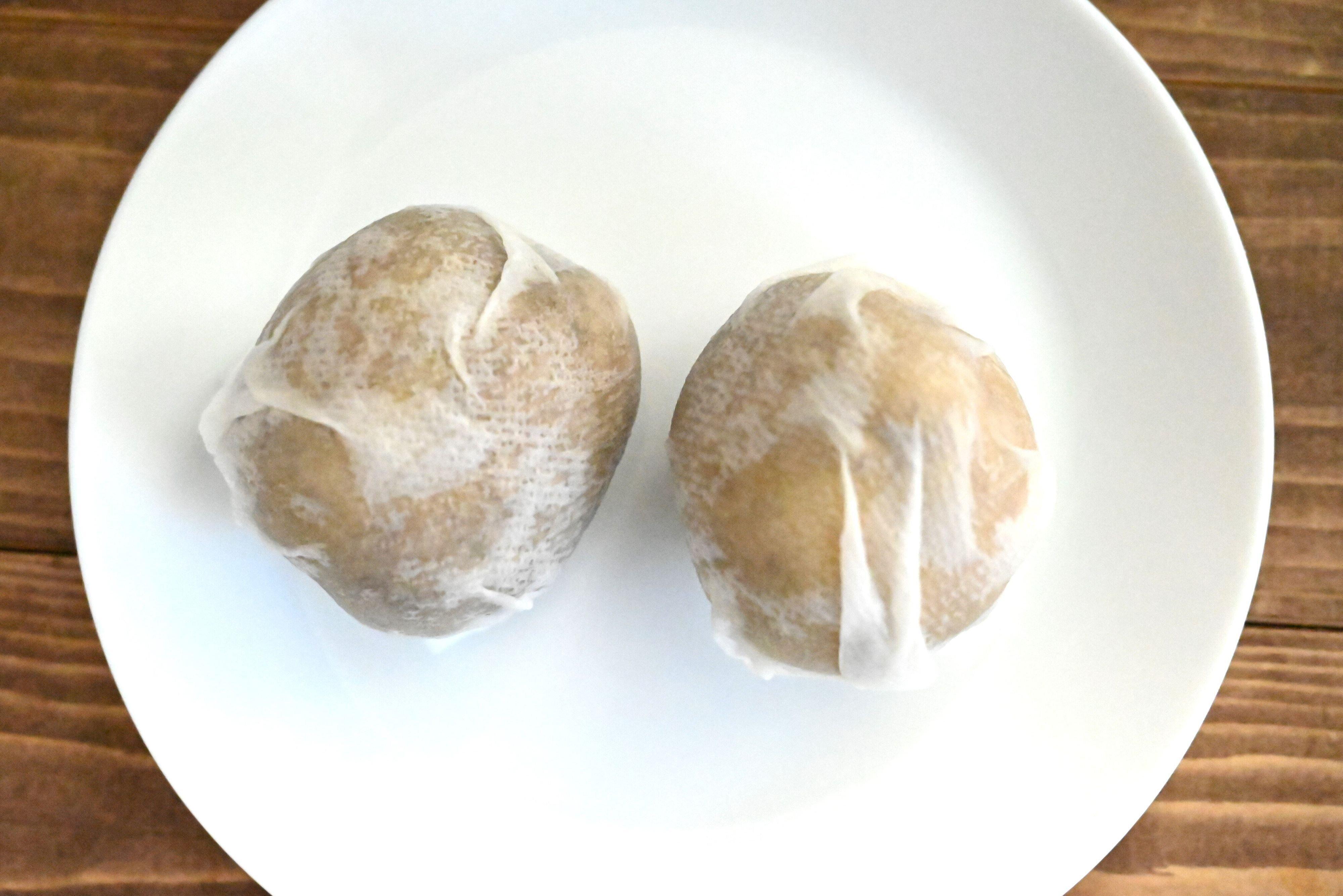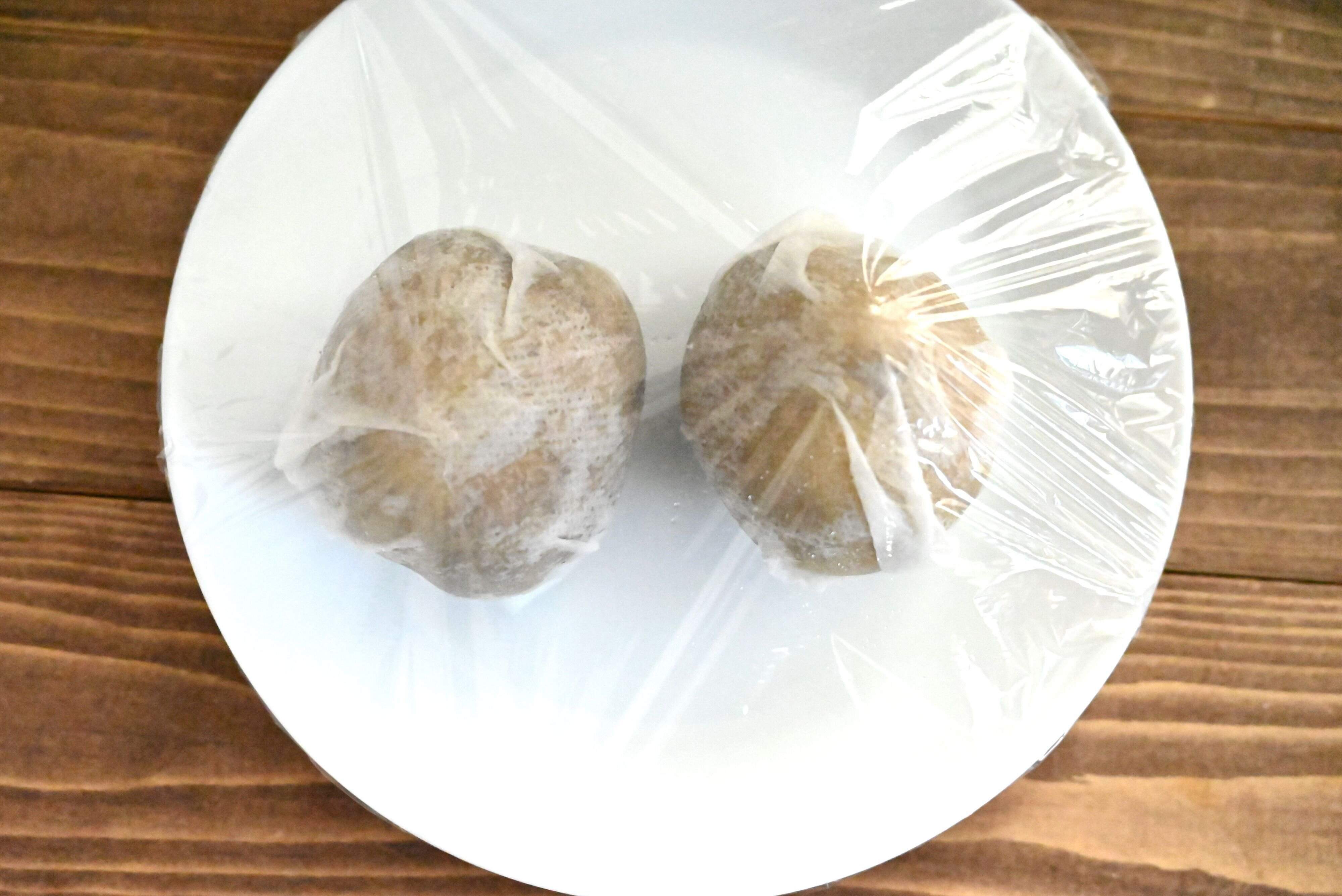 (1)洗ったじゃがいもをぬれたキッチンペーパーで1個ずつ包み、耐熱皿にのせてラップをする。600Wで4分加熱する。