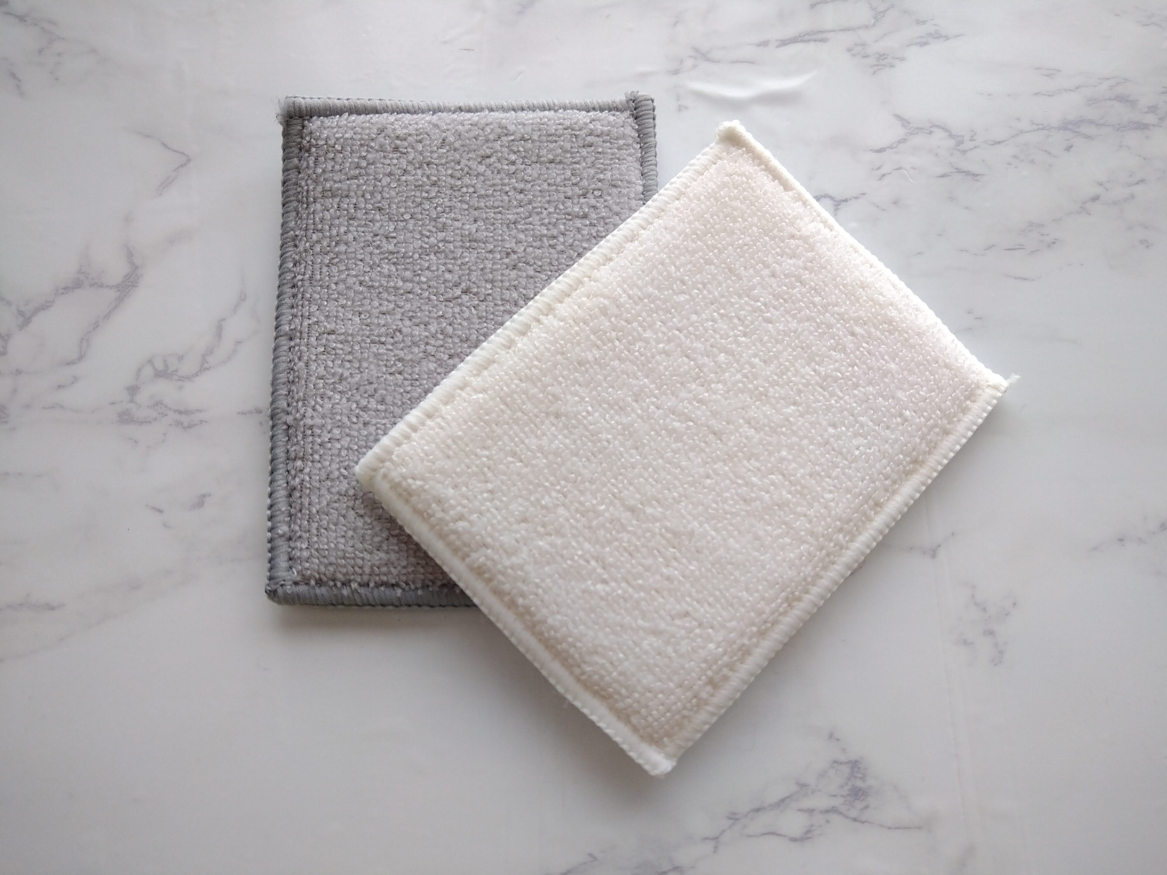 白とグレーが2個ずつ入っています。キッチンのスポンジといえば色鮮やかなものも多いのですが、落ち着いた色で安っぽくならずキッチンに馴染みます。
